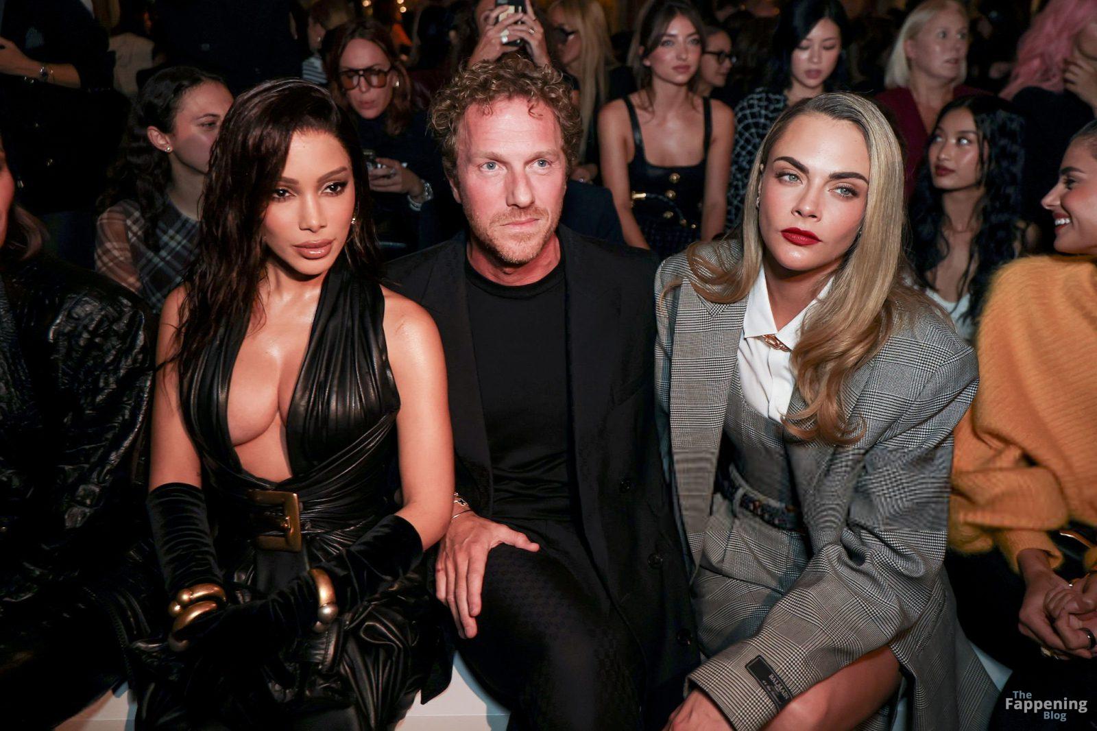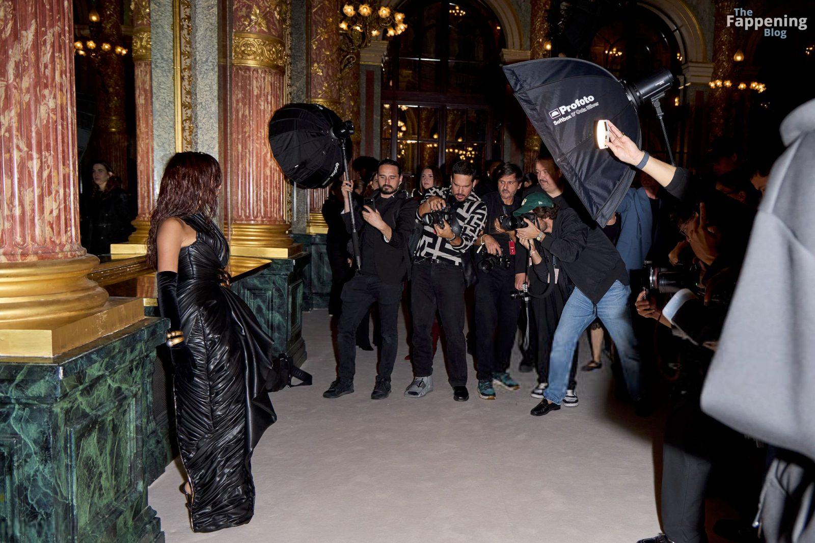 Sängerin Anitta zeigte ihr Dekolleté in Balmain’s schwarzem Lederkleid bei der Paris Fashion Week.