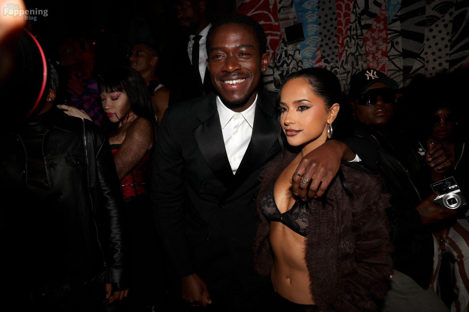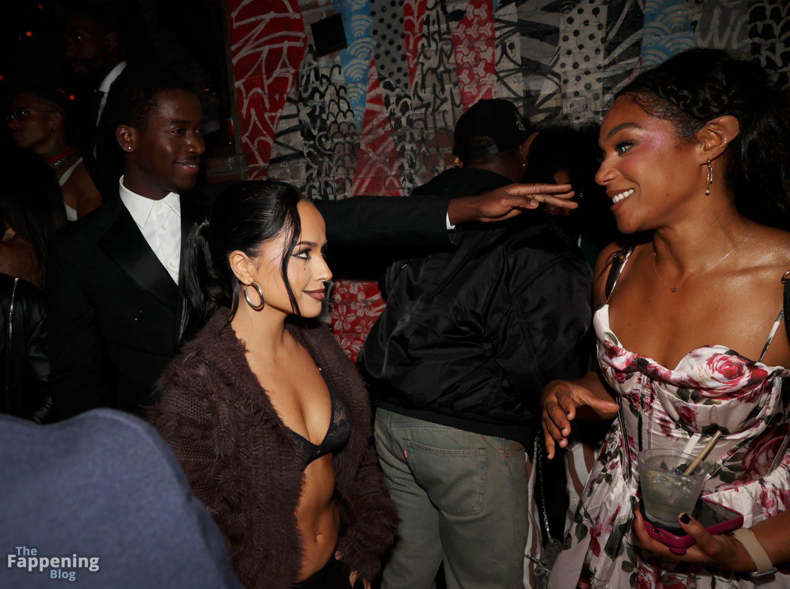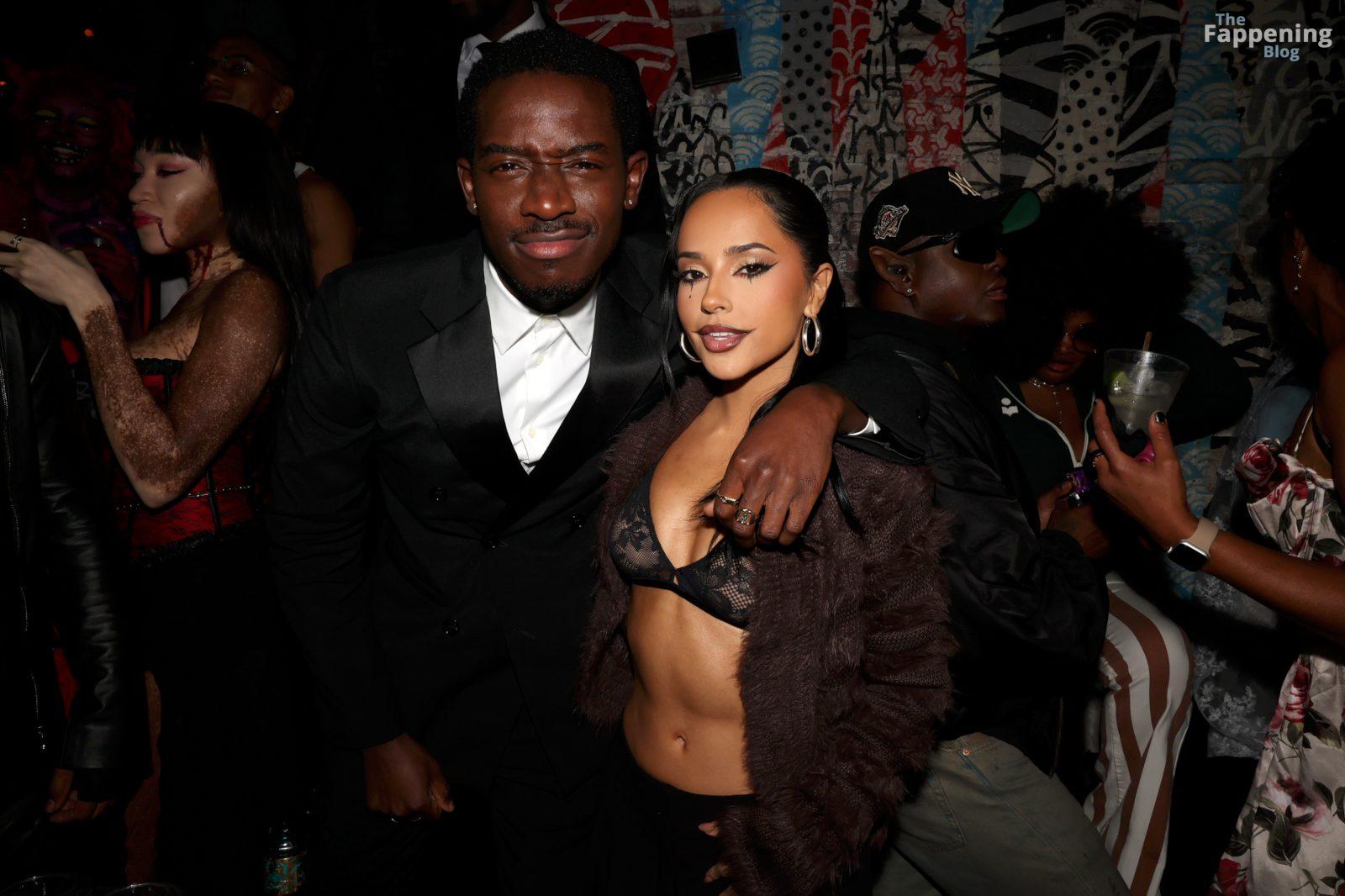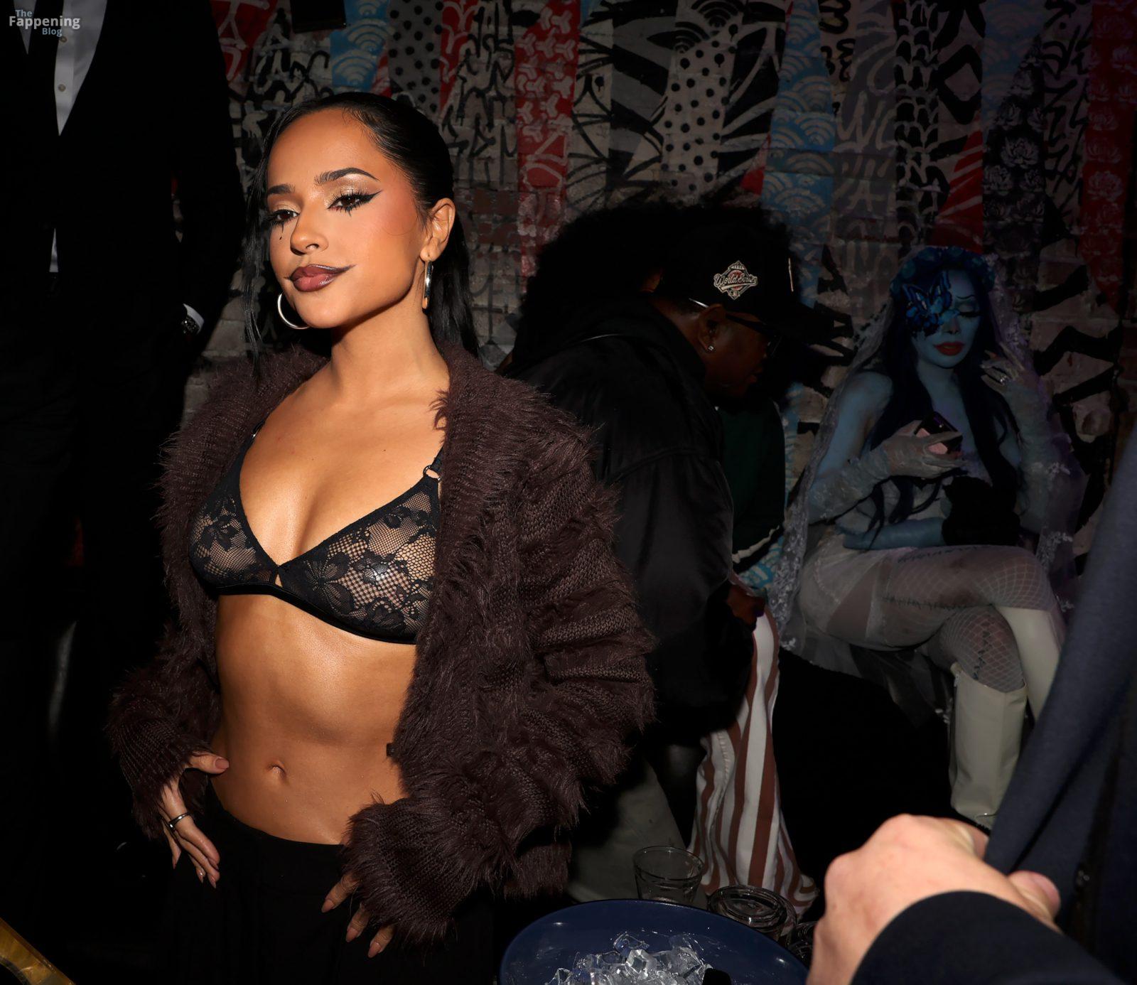 Becky G wurde im Costume Couture in NYC in einem durchsichtigen Bralette und einem flauschigen Cardigan fotografiert, wobei sie ihre Brüste und definierten Bauchmuskeln zeigte.
