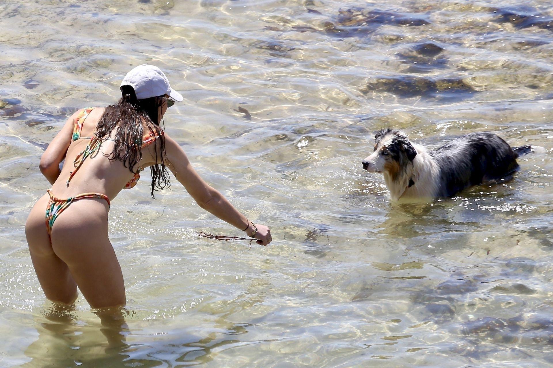 Australische Radiomoderatorin und ‘I’m A Celebrity’-TV-Star Brittany Hockley zeigt ihren durchtrainierten Bikini-Körper in einem geblümten Bikini am Tamarama Beach zusammen mit einer Freundin und ihrem Hund