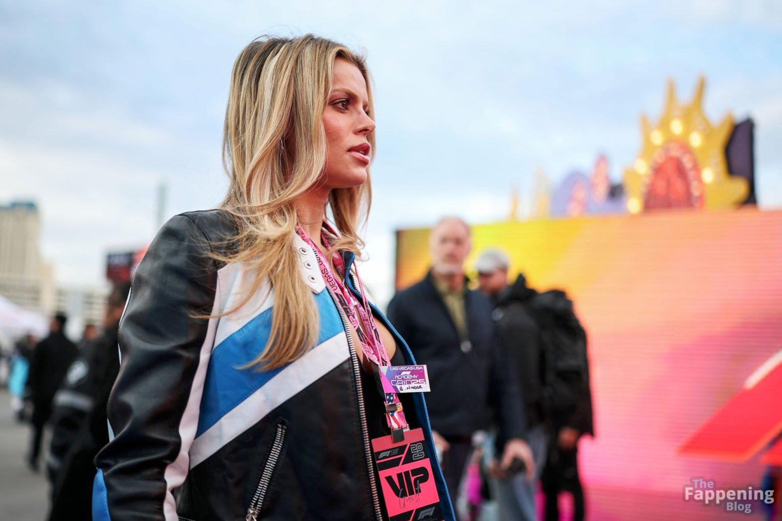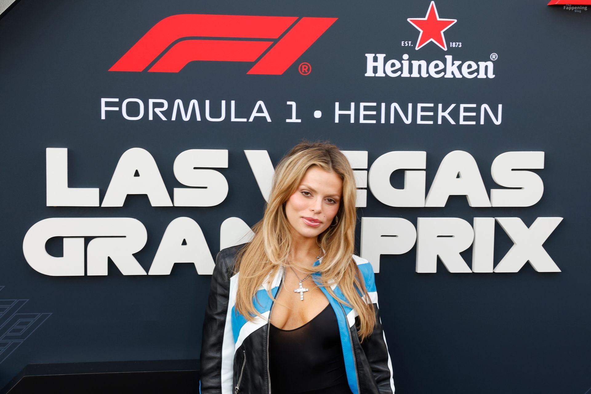 Model und Schauspielerin Brooks Nader verzichtet auf den BH in einem durchsichtigen Bodysuit beim Las Vegas Grand Prix auf dem Las Vegas Strip Circuit.