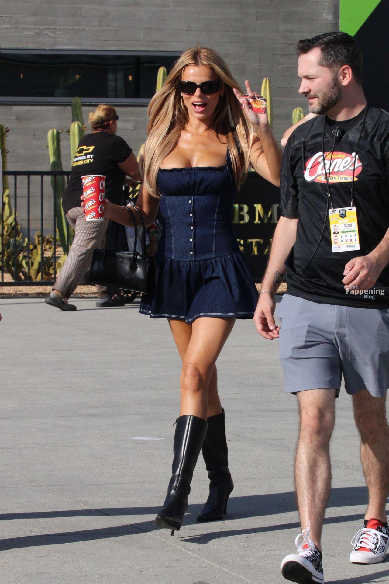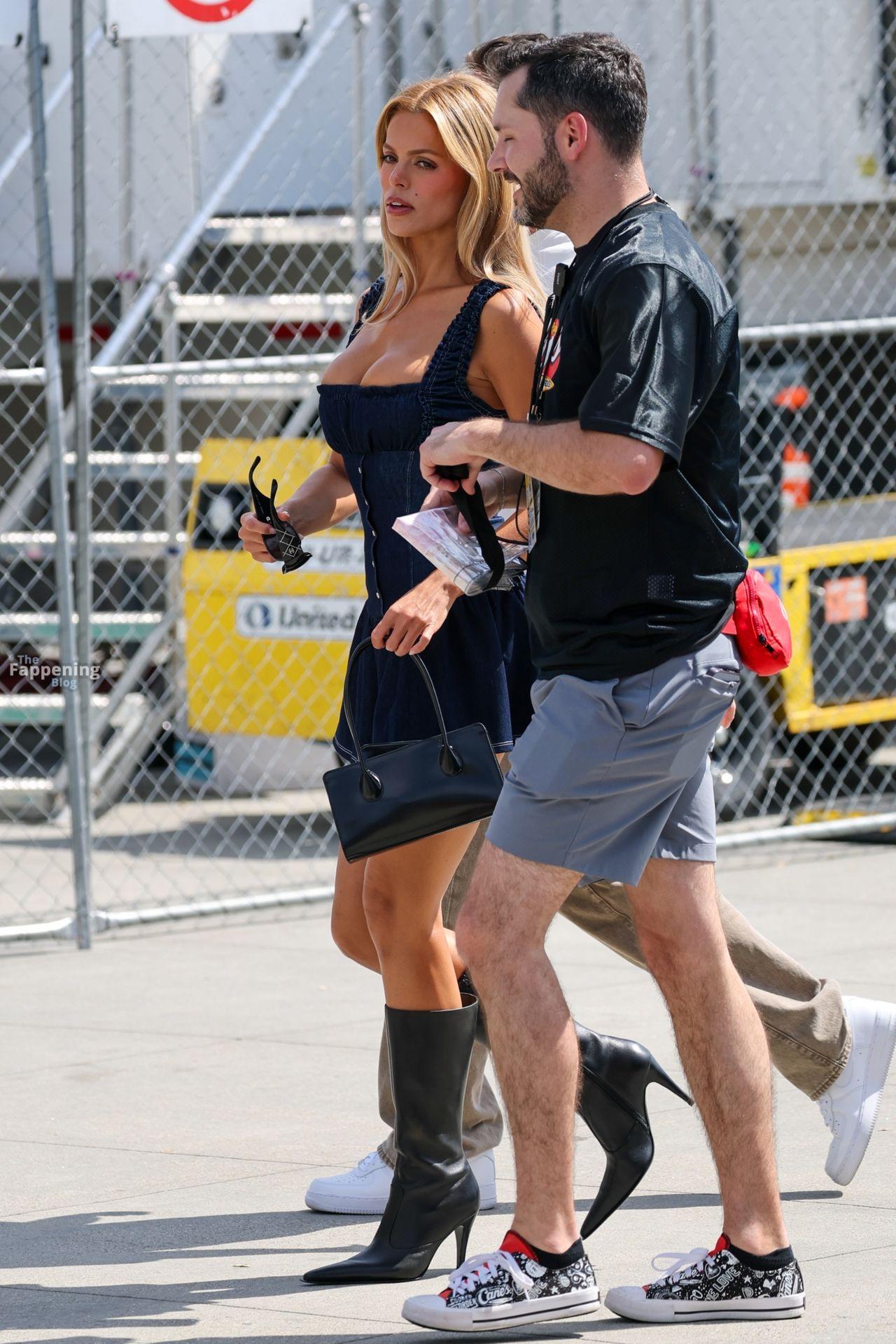 Brooks Nader wird gesehen, wie sie das Fanatics Flag Football-Spiel verlässt, ohne Unterwäsche in einem Jeans-Kurzkleid, kombiniert mit langen schwarzen Stiefeln und Sonnenbrille, während sie nach der Veranstaltung hinausgeht.