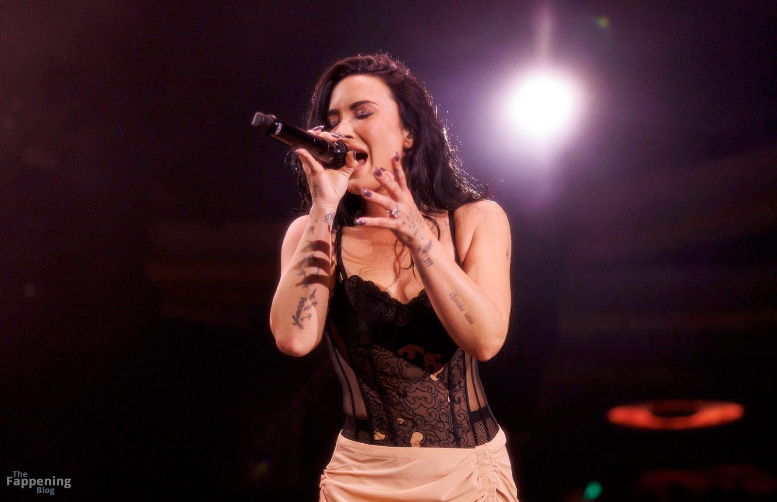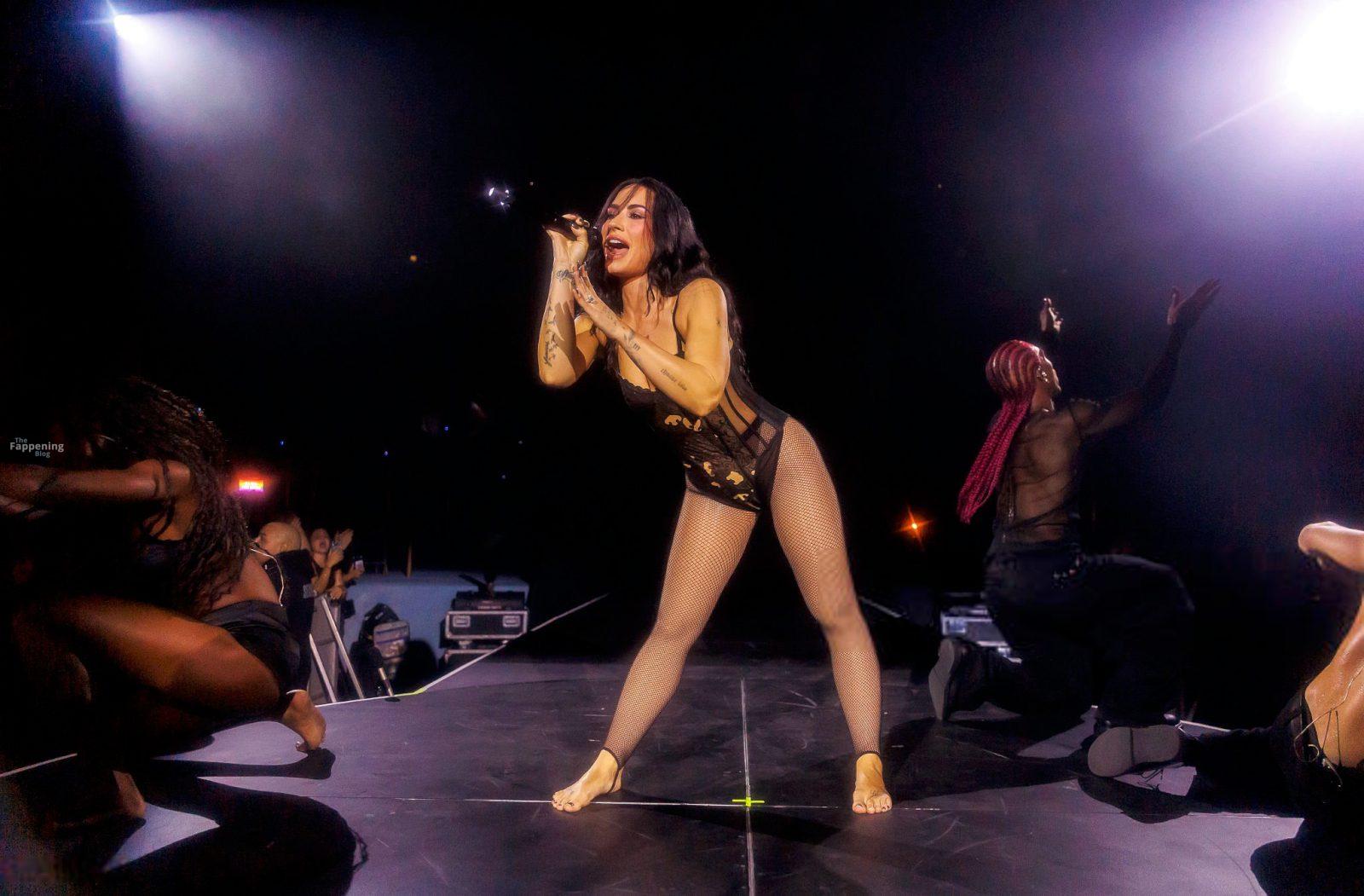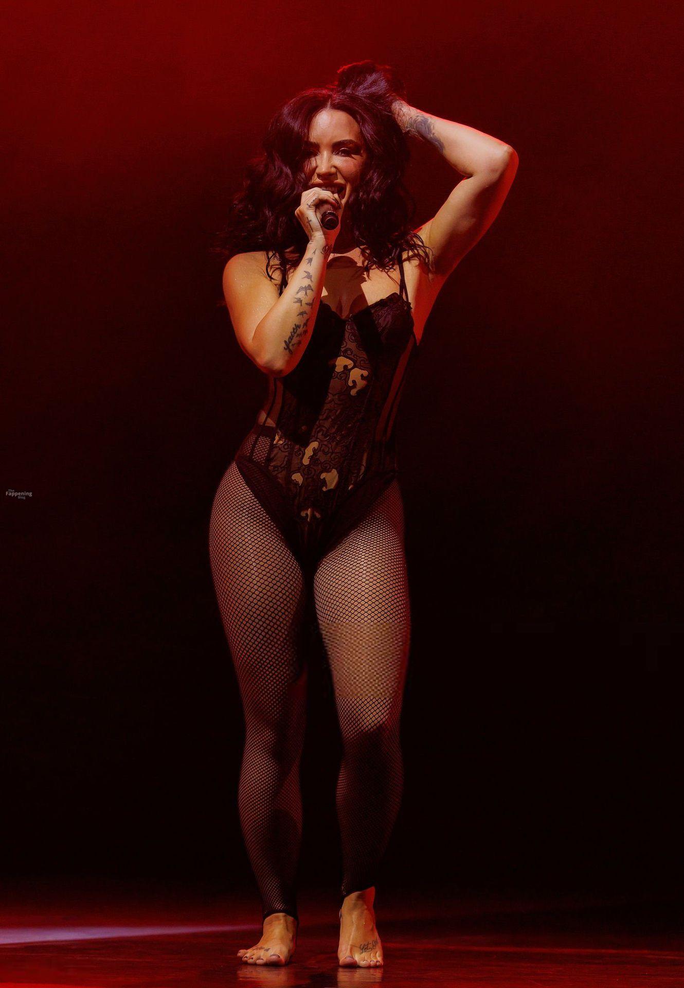 Schau dir Demi Lovatos Auftritt im Hollywood Palladium an. Sie betrat die Bühne in einem durchsichtigen Body und Netzstrümpfen.