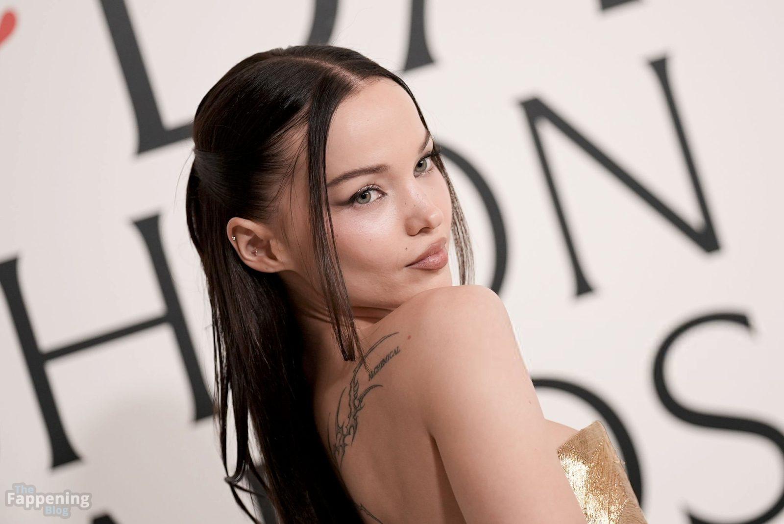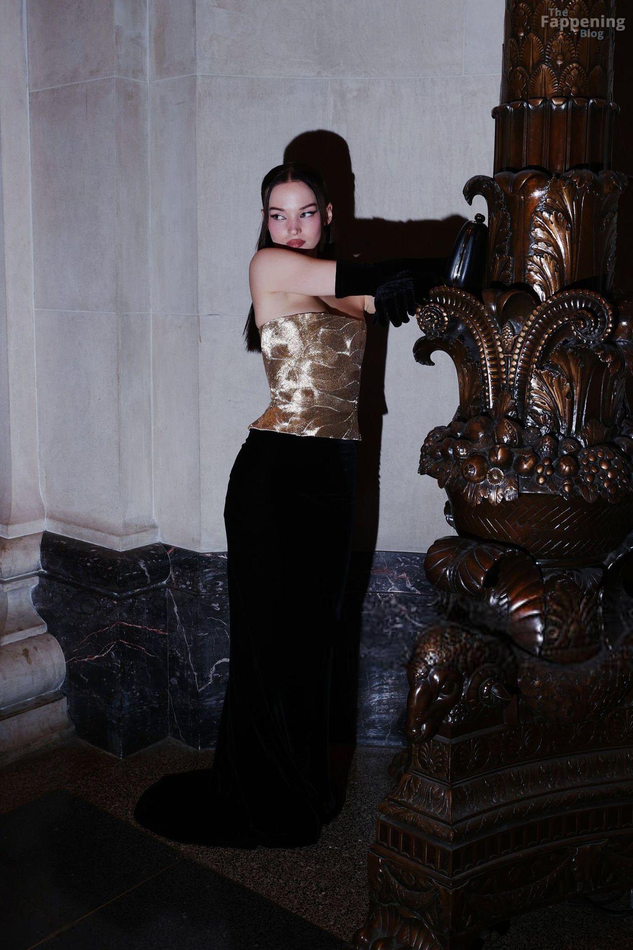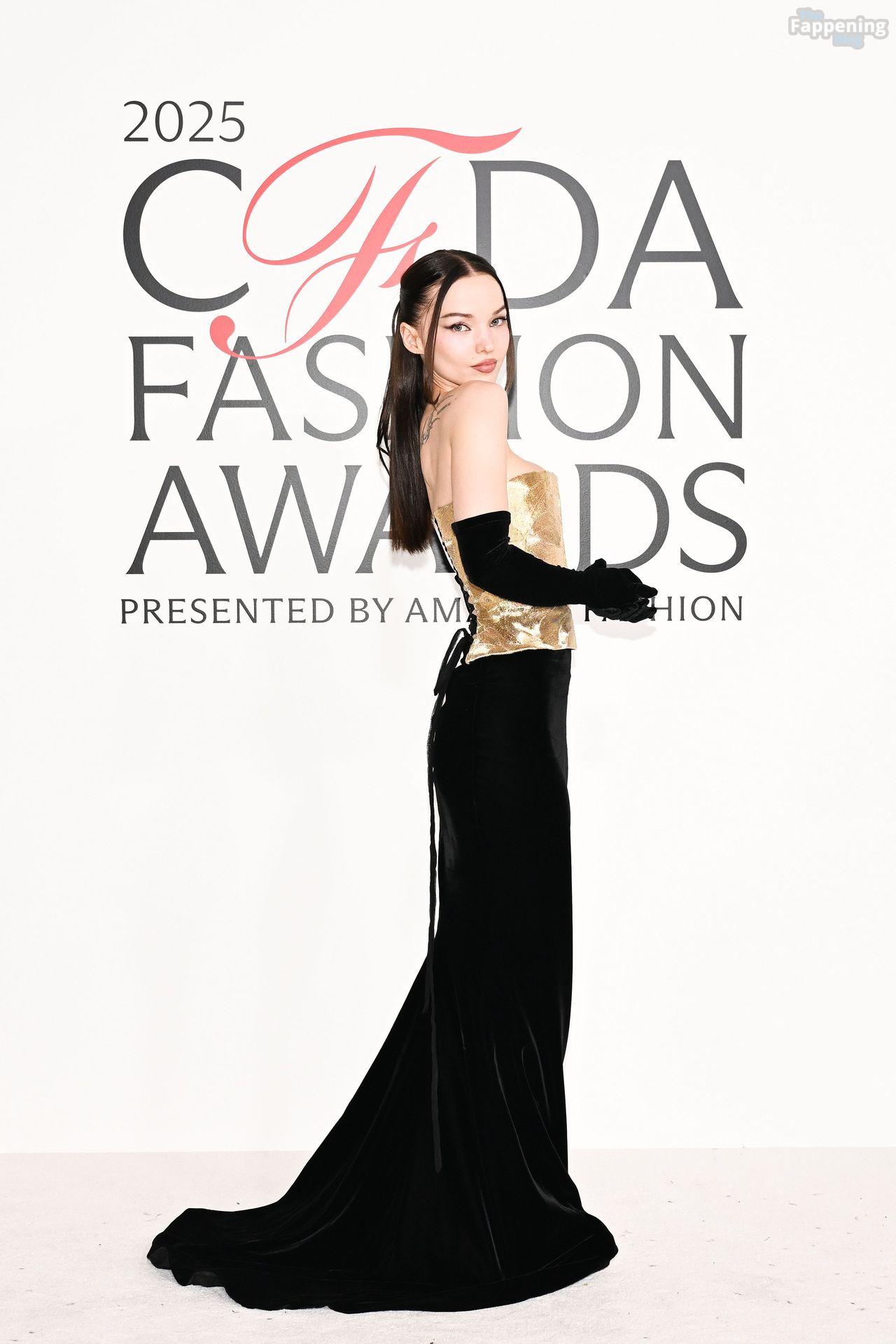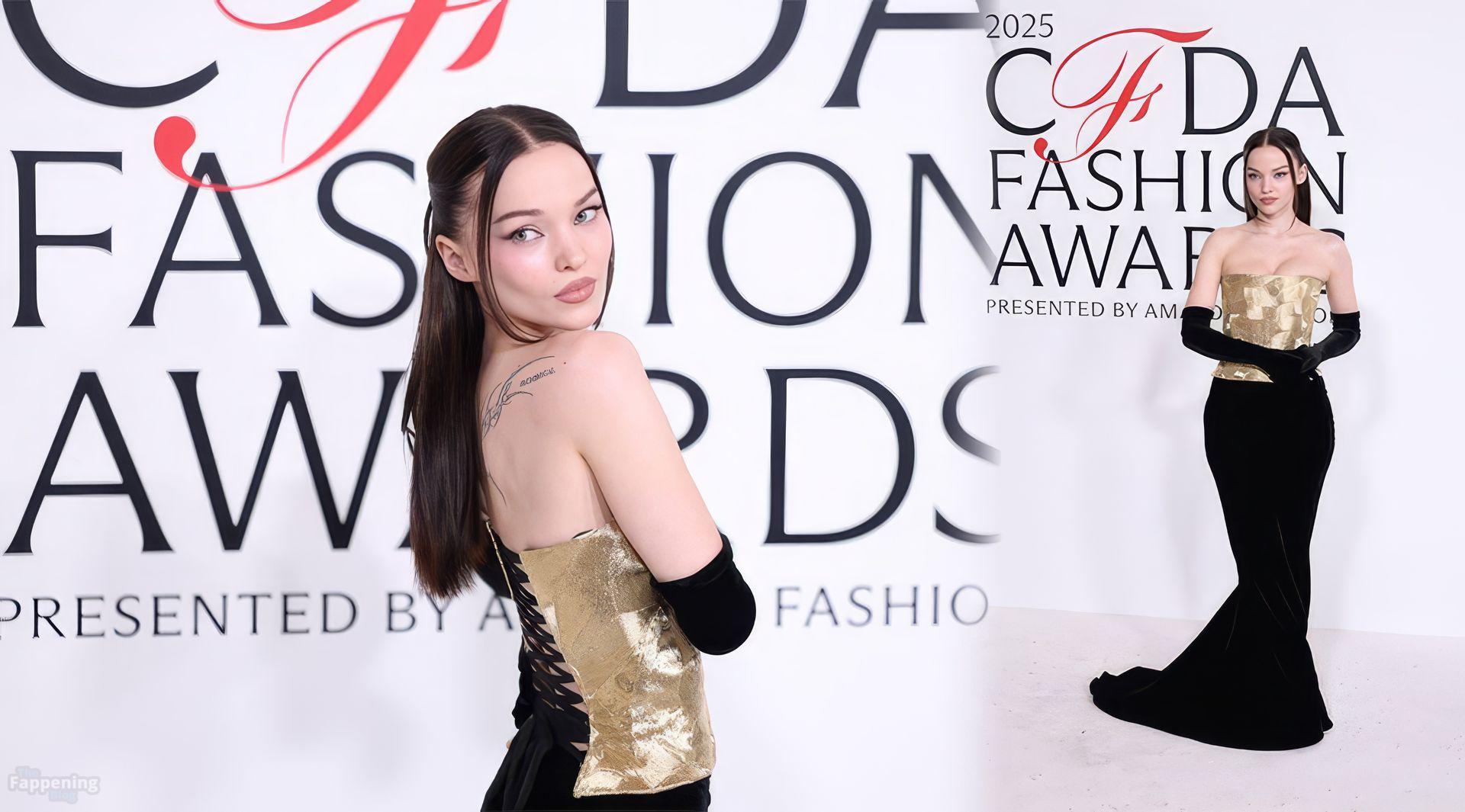 Dove Cameron erschien bei den CFDA Fashion Awards 2025 in New York City und trug ein trägerloses goldenes Marc Jacobs Kleid mit Korsett-Oberteil und schwarzen Handschuhen. Sie posierte auf dem roten Teppich im American Museum of Natural History.