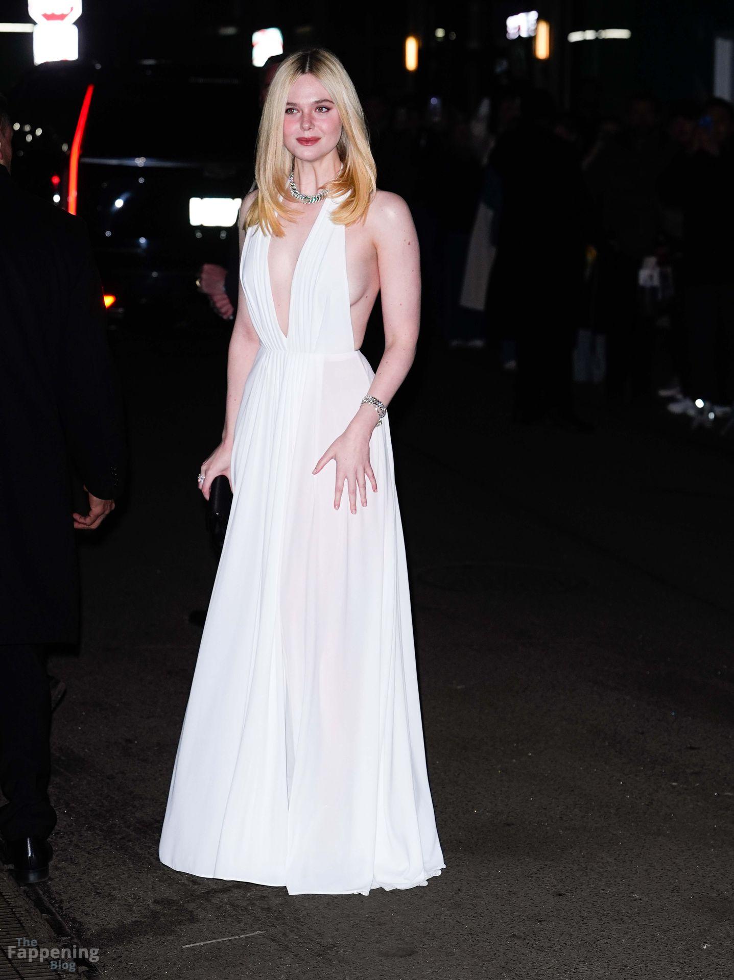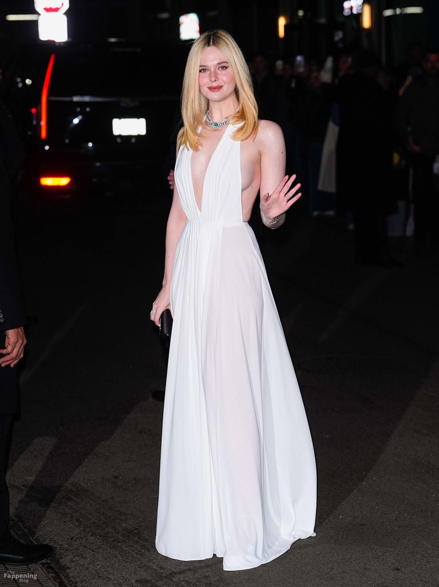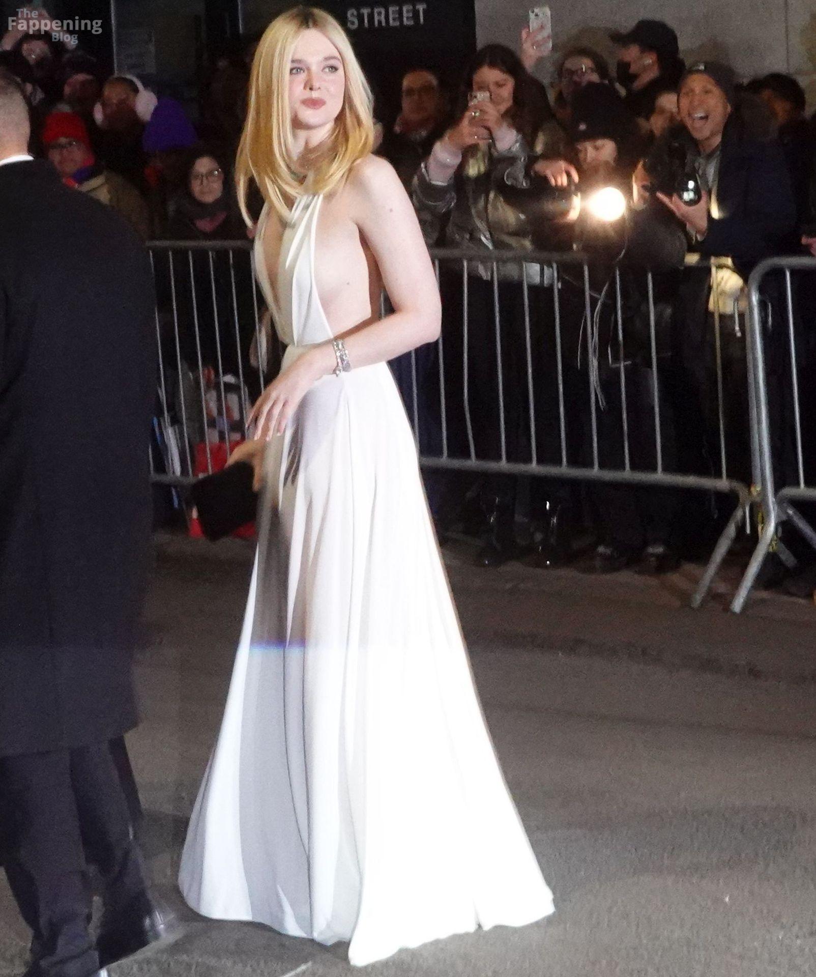 Elle Fanning erschien bei den Gotham Awards ohne BH – mit tiefem Ausschnitt, freiem Rücken und einem Blick auf ihren Sideboob auf dem roten Teppich. Danach ging sie zur Wall Street und sah aus wie eine Göttin in einem fließenden weißen Neckholder-Kleid.