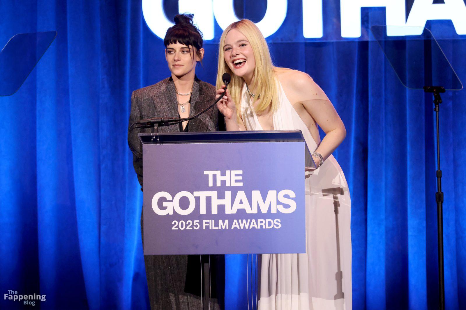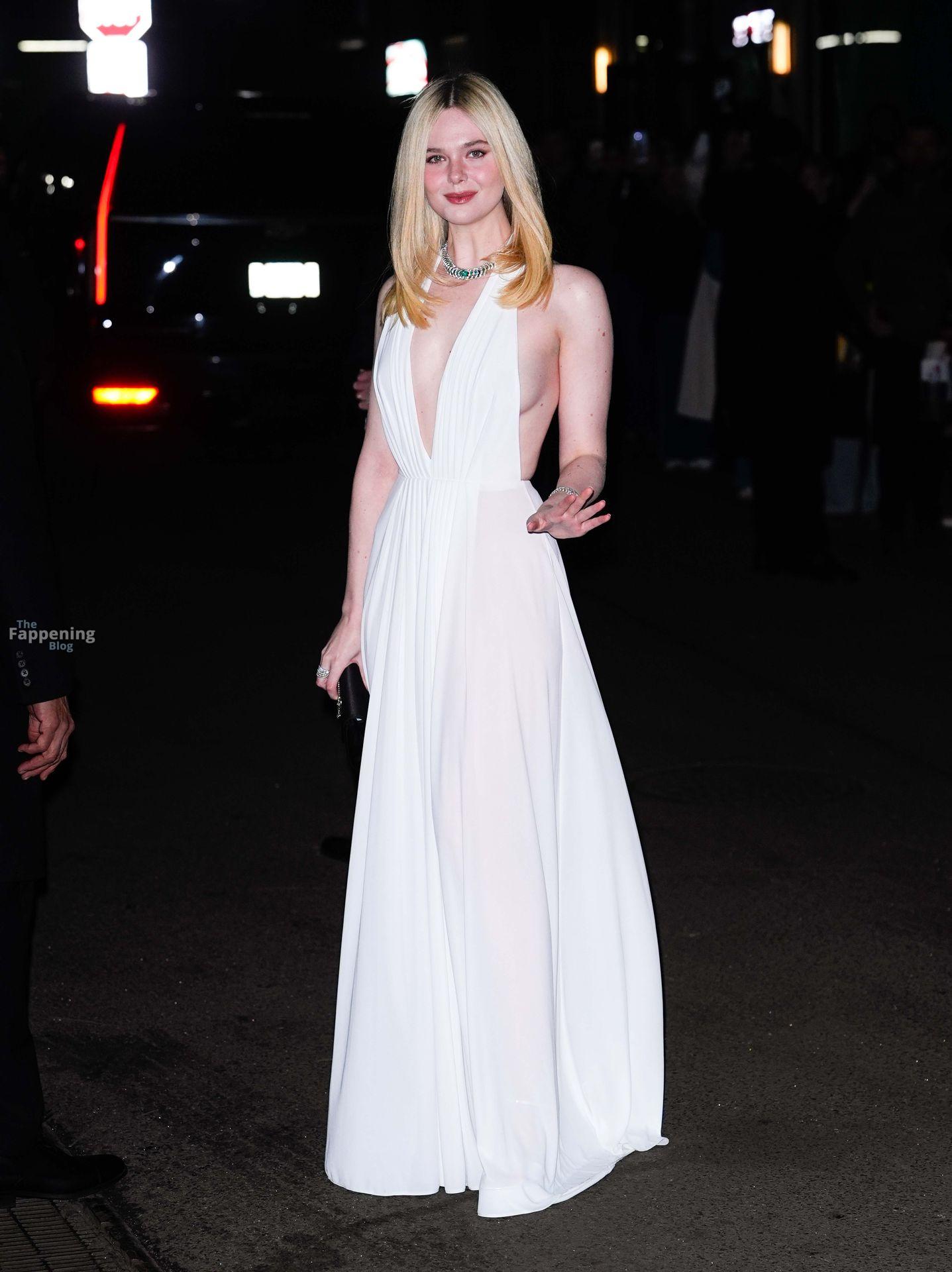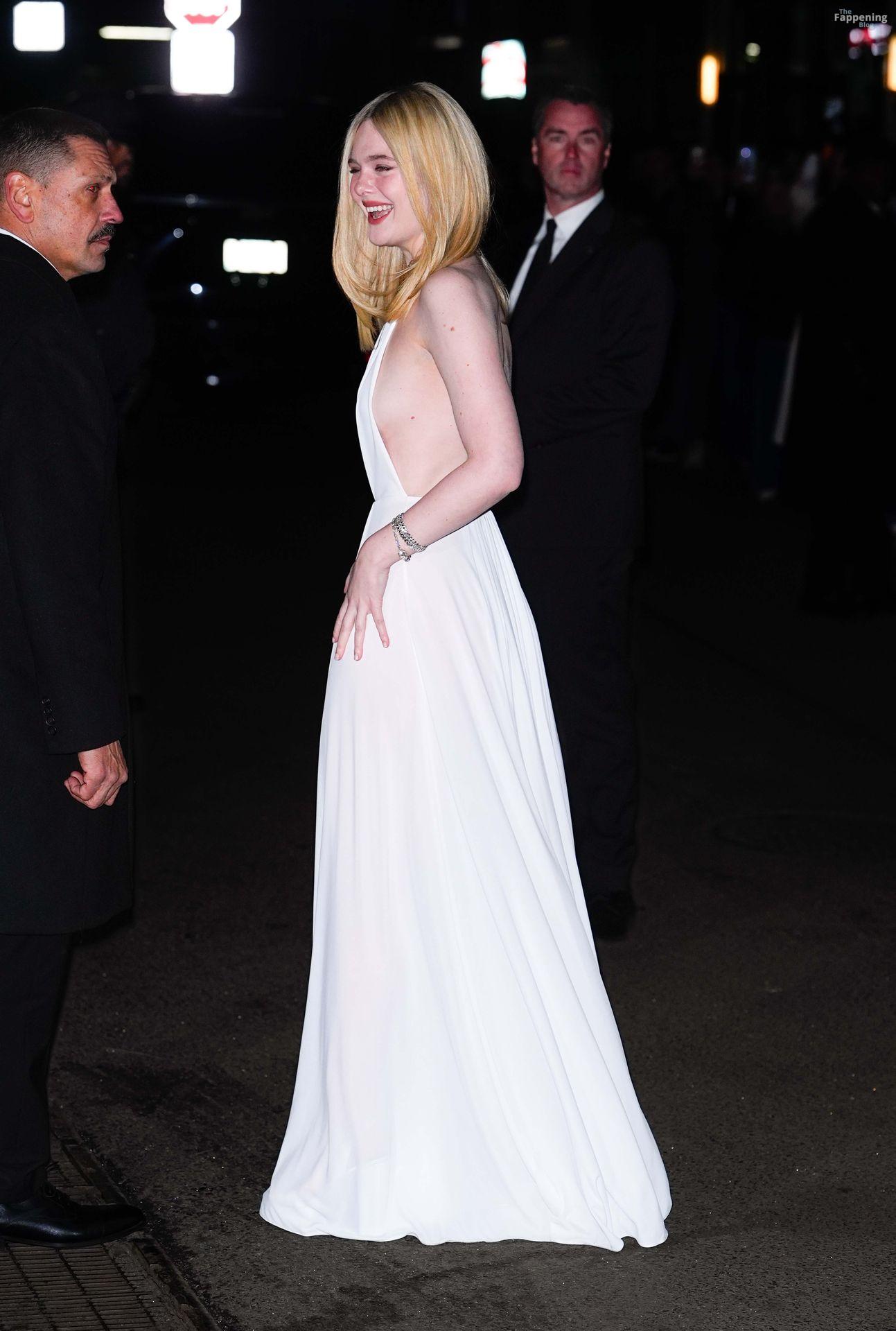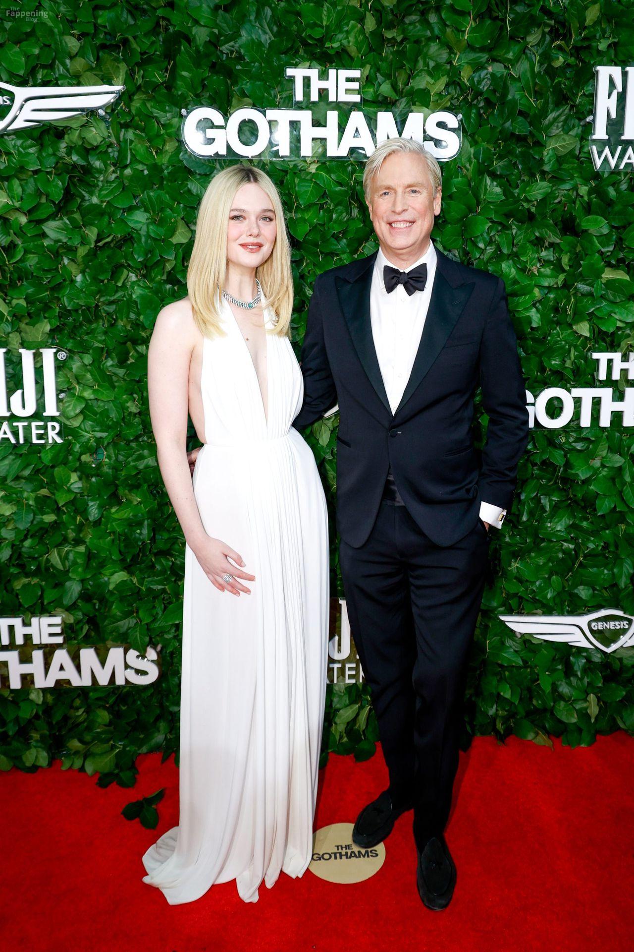 Elle Fanning erschien bei den Gotham Awards ohne BH – mit tiefem Ausschnitt, freiem Rücken und einem Blick auf ihren Sideboob auf dem roten Teppich. Danach ging sie zur Wall Street und sah aus wie eine Göttin in einem fließenden weißen Neckholder-Kleid.