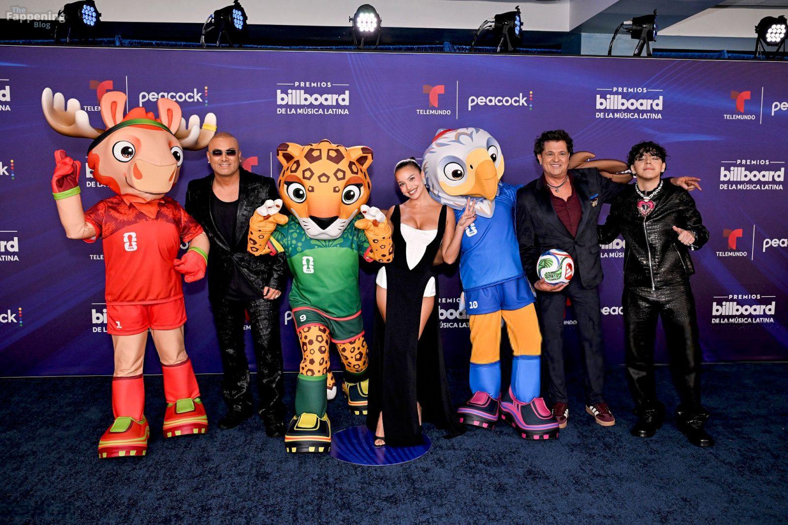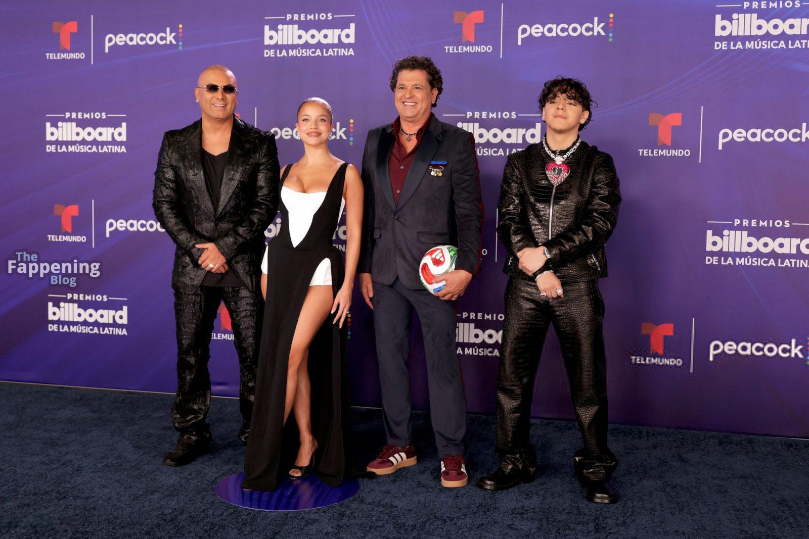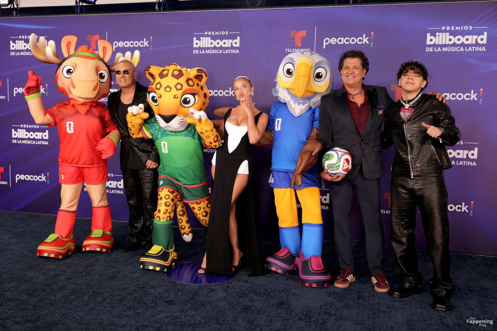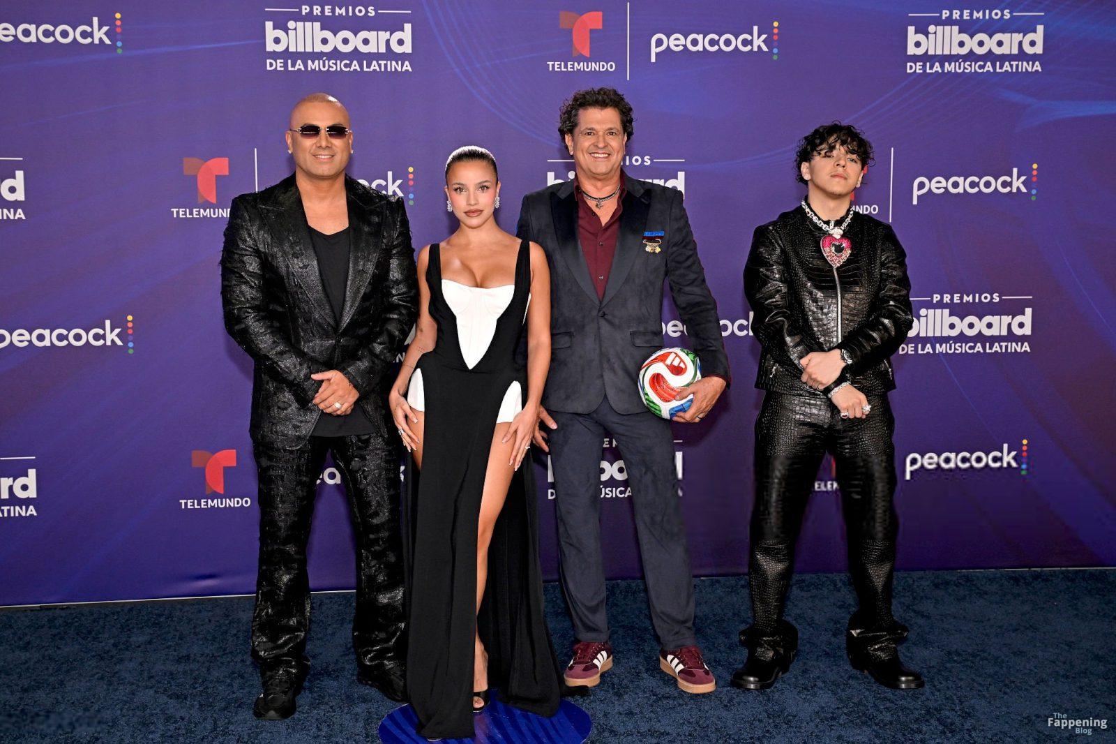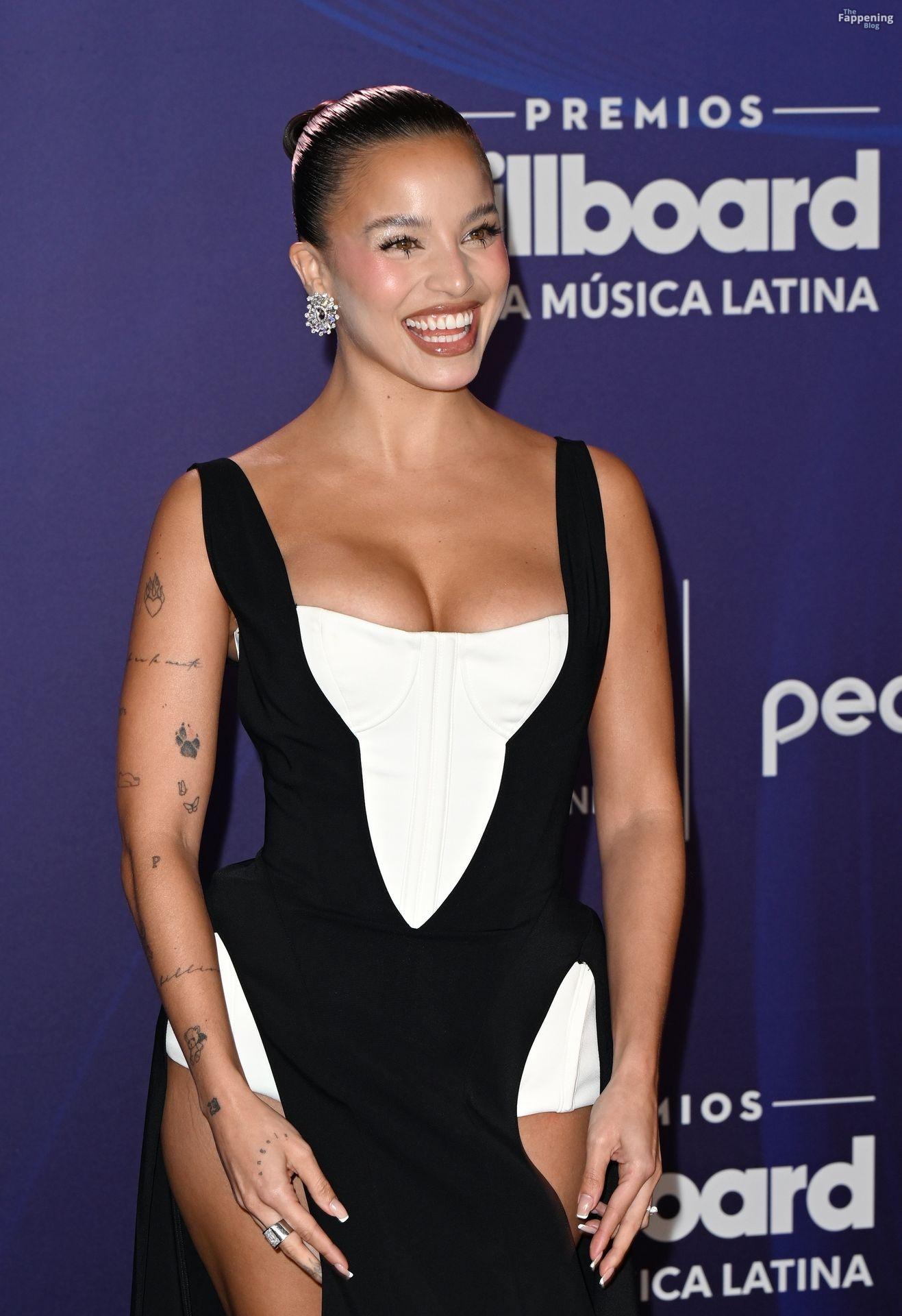 Emilia Mernes nahm an den Billboard Latin Music Awards 2025 in Miami teil und trug ein schwarz-weißes Kleid mit hohem Schlitz, das ihre großen Brüste und ihre straffen Beine zur Geltung brachte. Sie betrat den roten Teppich im James L. Knight Center.