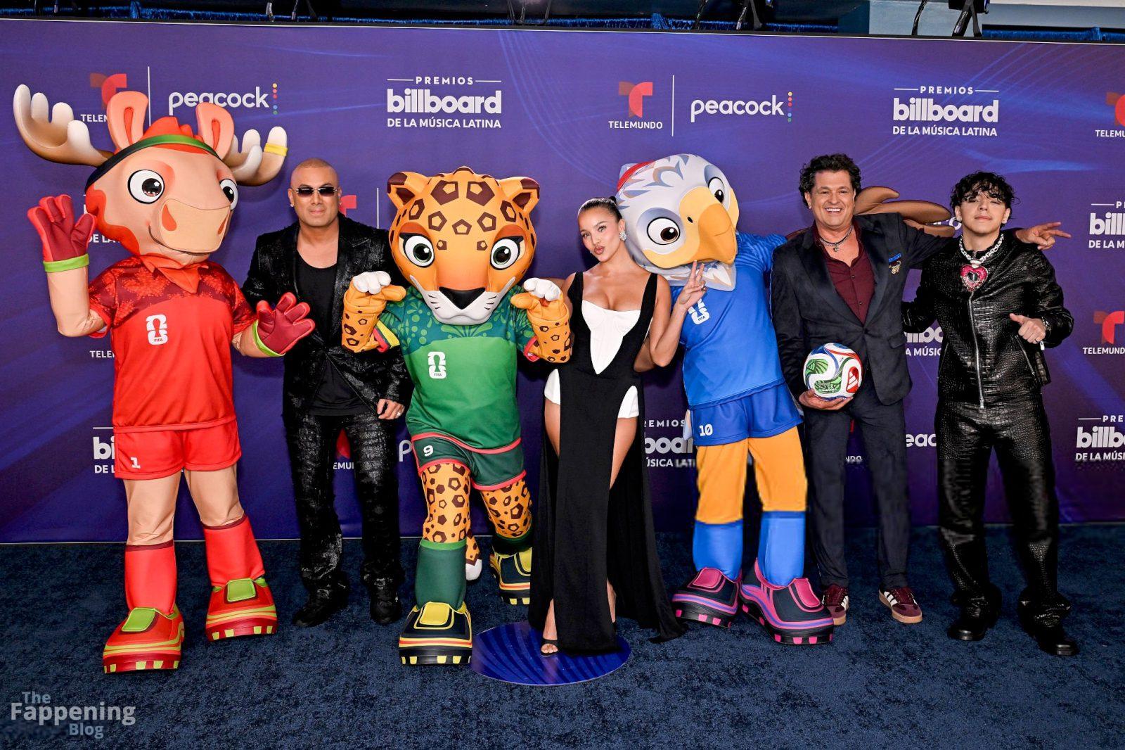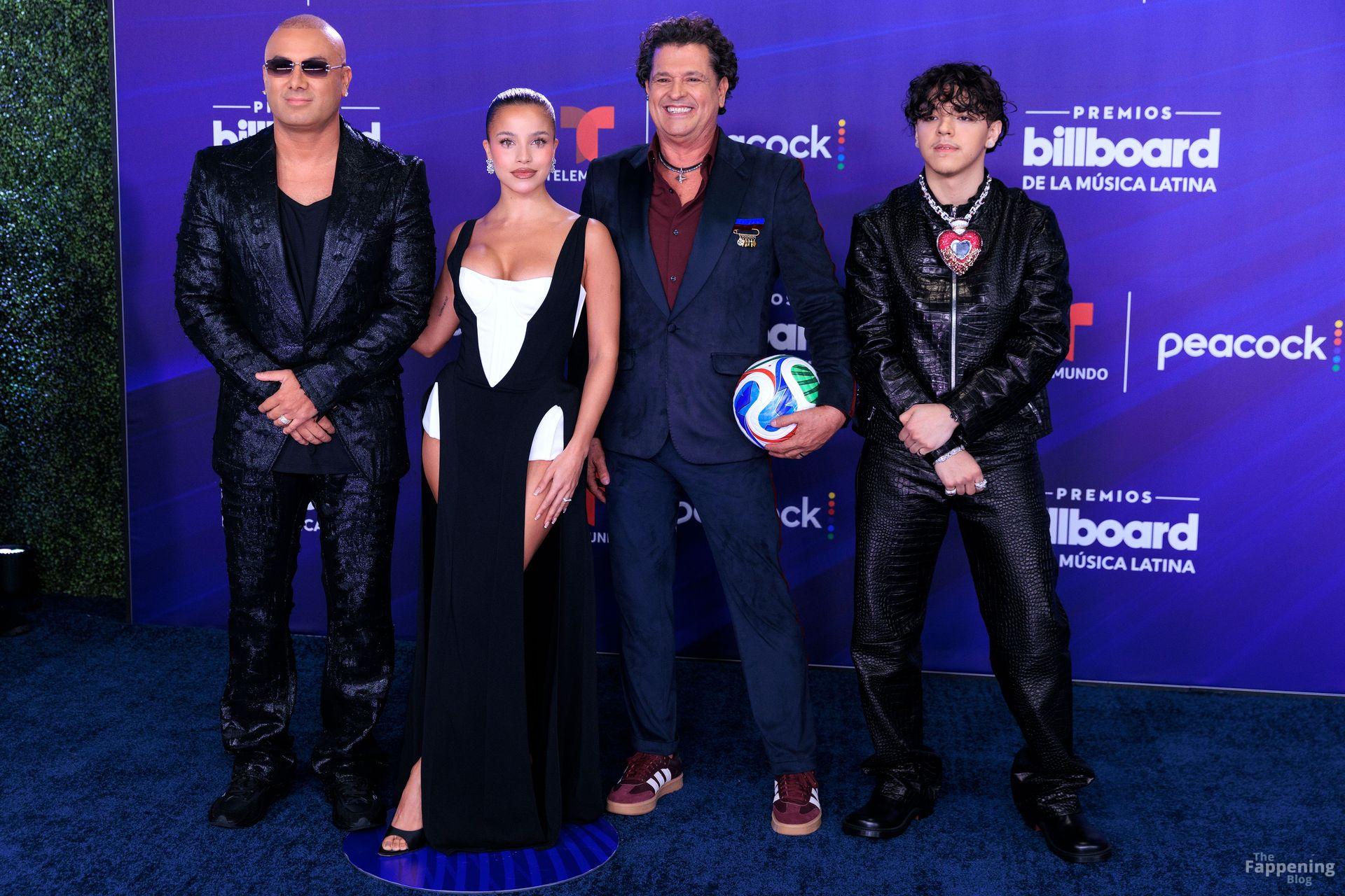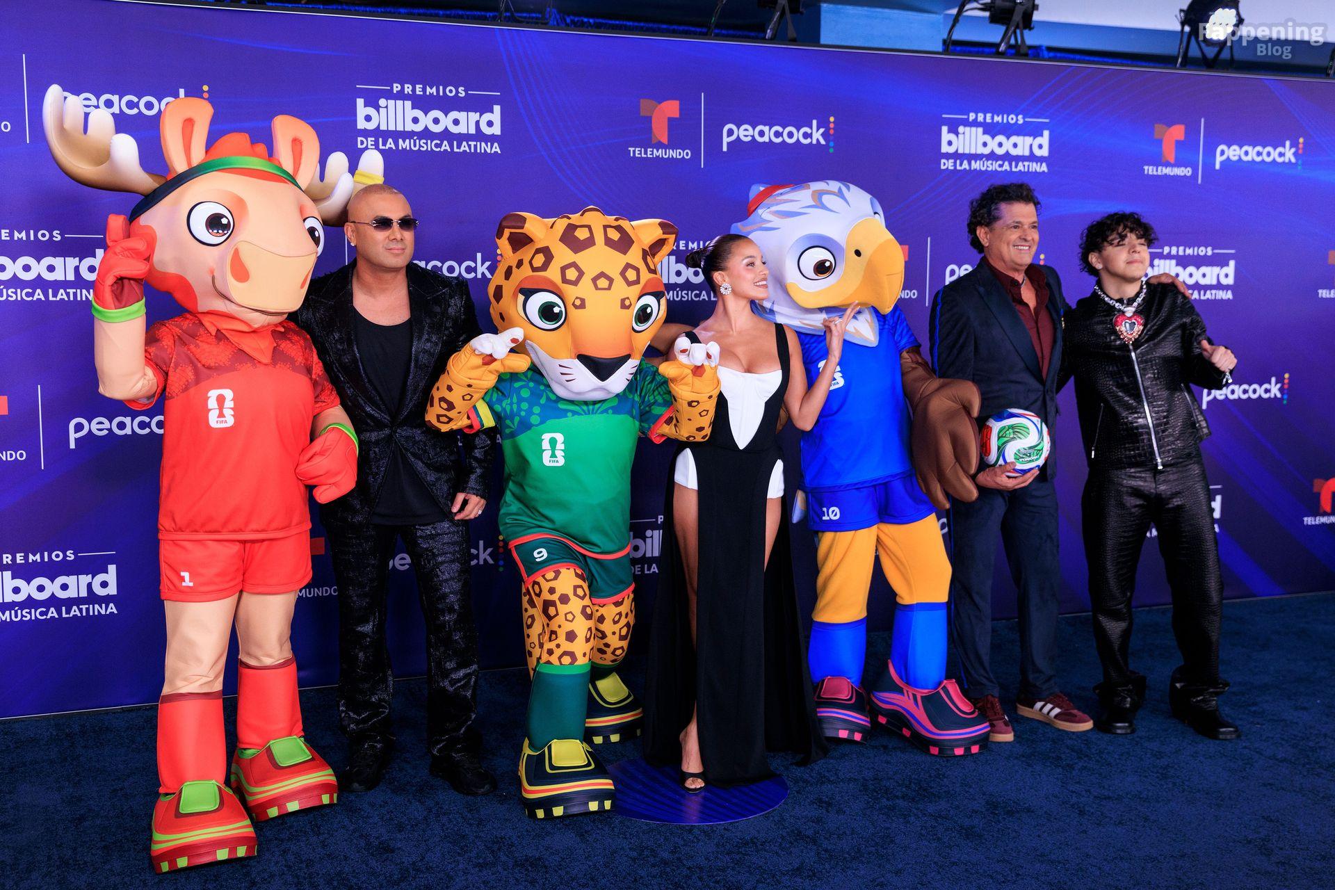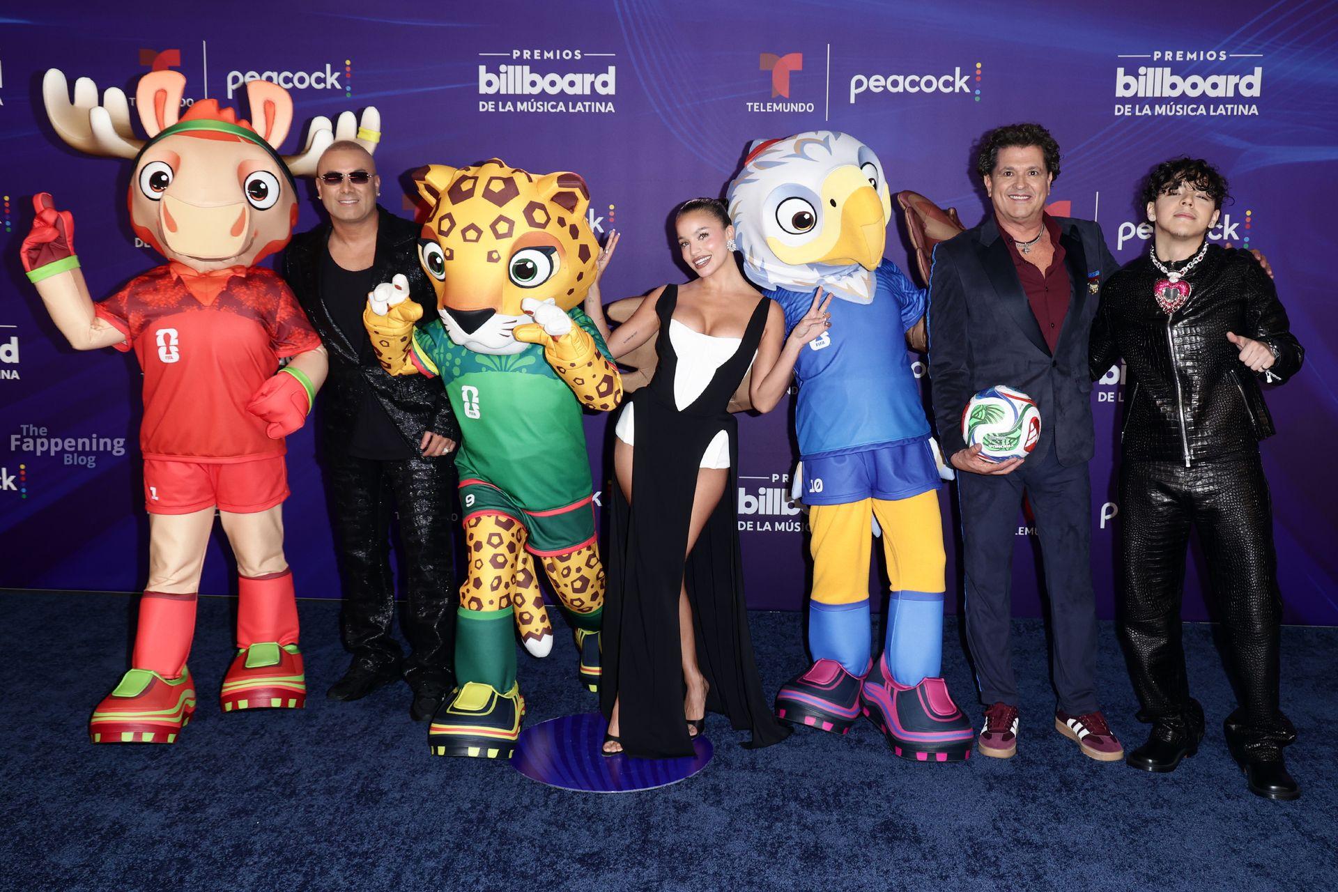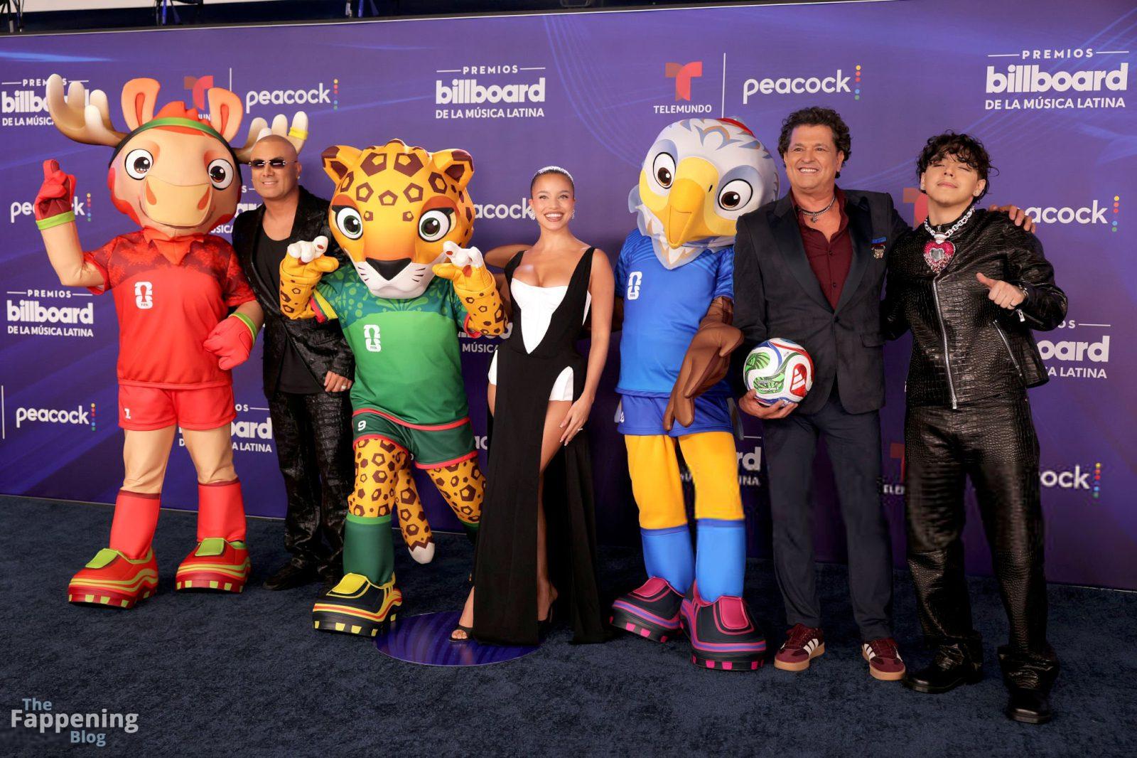 Emilia Mernes nahm an den Billboard Latin Music Awards 2025 in Miami teil und trug ein schwarz-weißes Kleid mit hohem Schlitz, das ihre großen Brüste und ihre straffen Beine zur Geltung brachte. Sie betrat den roten Teppich im James L. Knight Center.