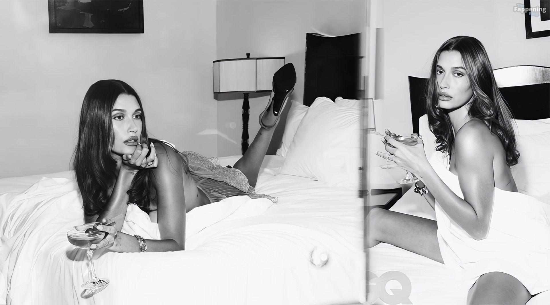 Model Hailey Bieber ist im GQ Poolside-Shooting November 2025 – schau dir ihre Beine und Brüste an.