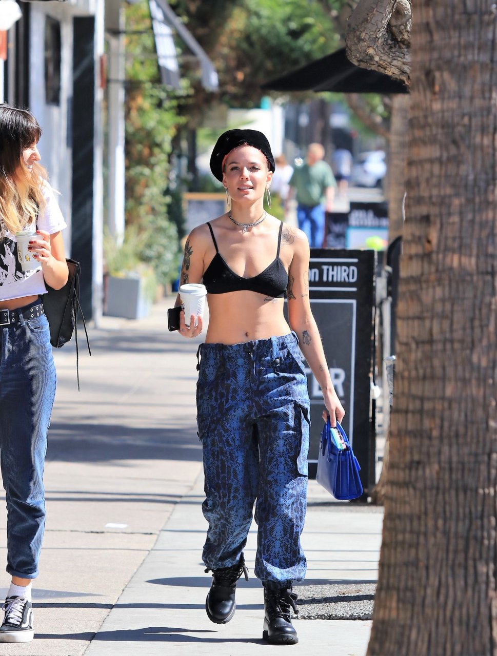 Halsey lächelt, während sie nur einen schwarzen BH und Schlangenlederhosen trägt und sich bei Gerüchten, dass sie sich erneut von Rapper G-Eazy getrennt hat, einen Nachmittagskaffee holt. Die Sängerin lächelte, als sie Joans on Third verließ. Los Angeles, Kalifornien, 24.12.2018.