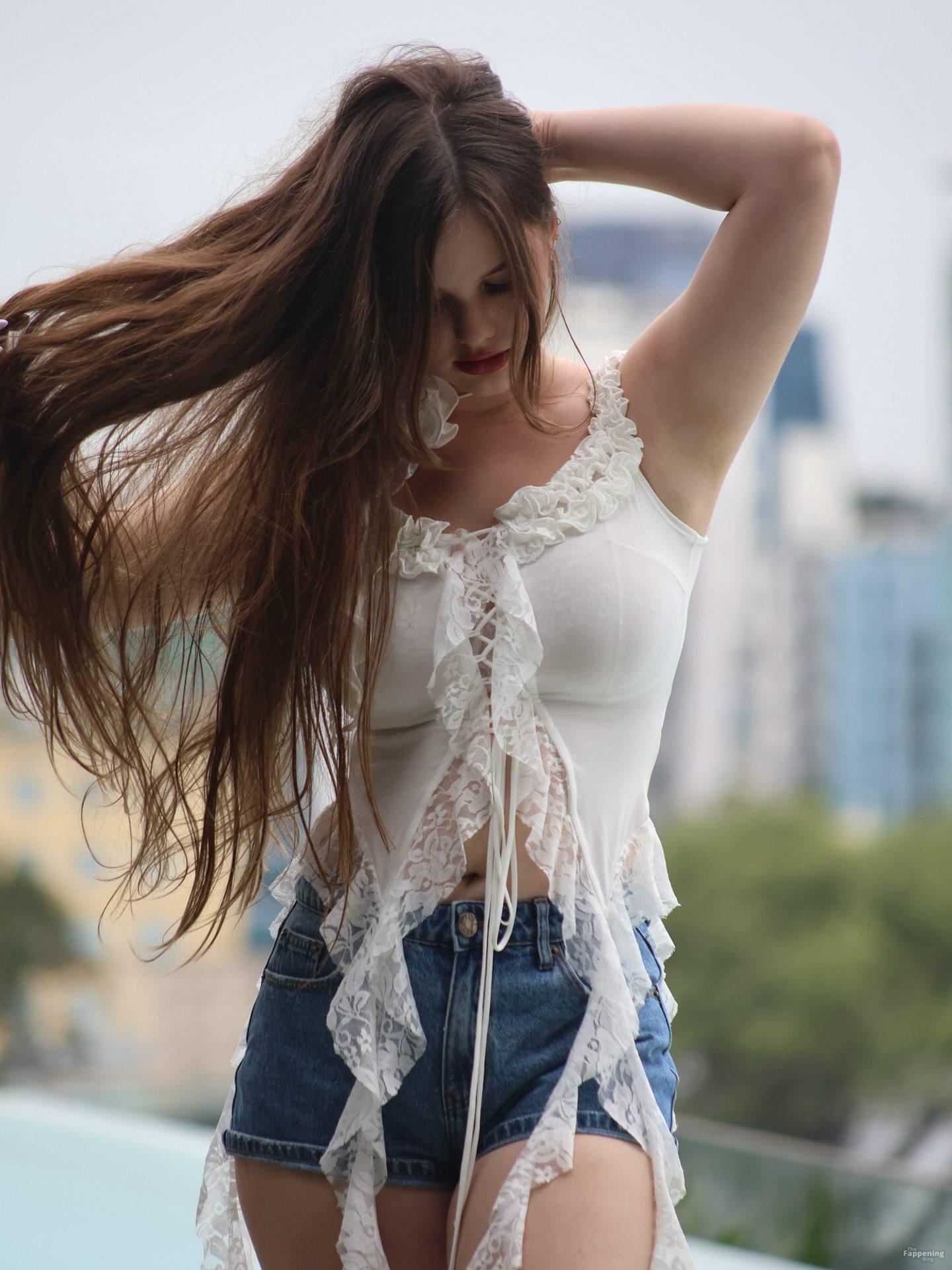 Isabella Ardley posiert am Pool in einem stilvollen Schnür-Top und Shorts und zeigt ihre schönen Brüste und Figur.