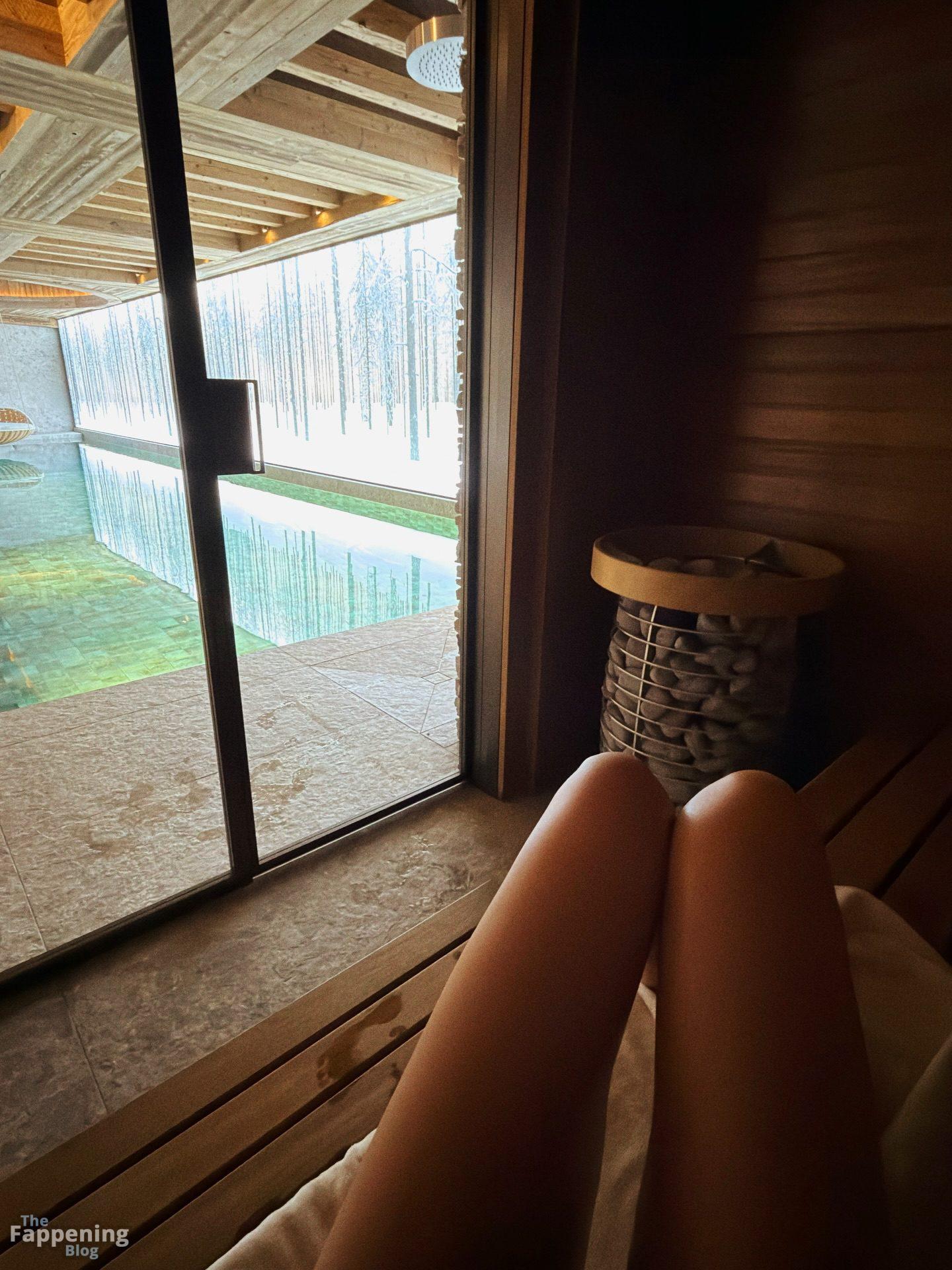 Julia Cavanagh posiert in einem winzigen tropischen Bikini und zeigt ihren geölten Körper in der Sauna.