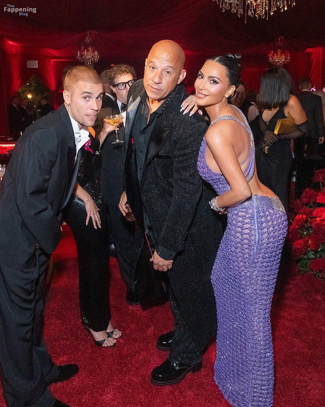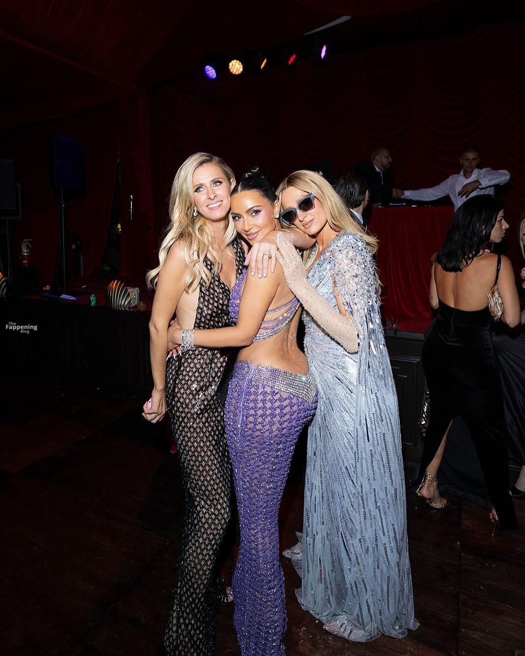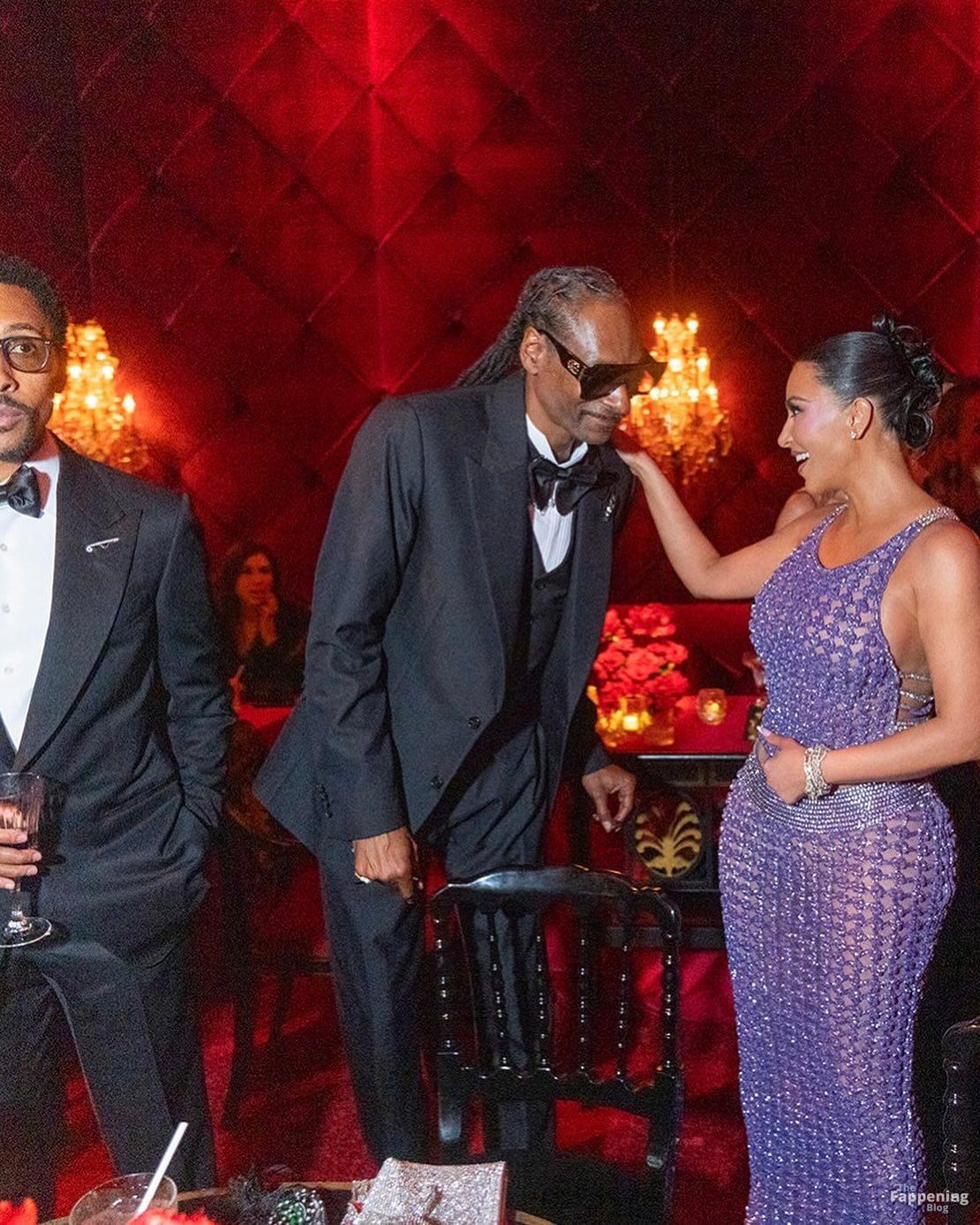 Kim Kardashian trägt ein durchsichtiges lila Netzkleid und zeigt ihren Hintern und ihre Brüste auf einer vollbesetzten Promi-Party.