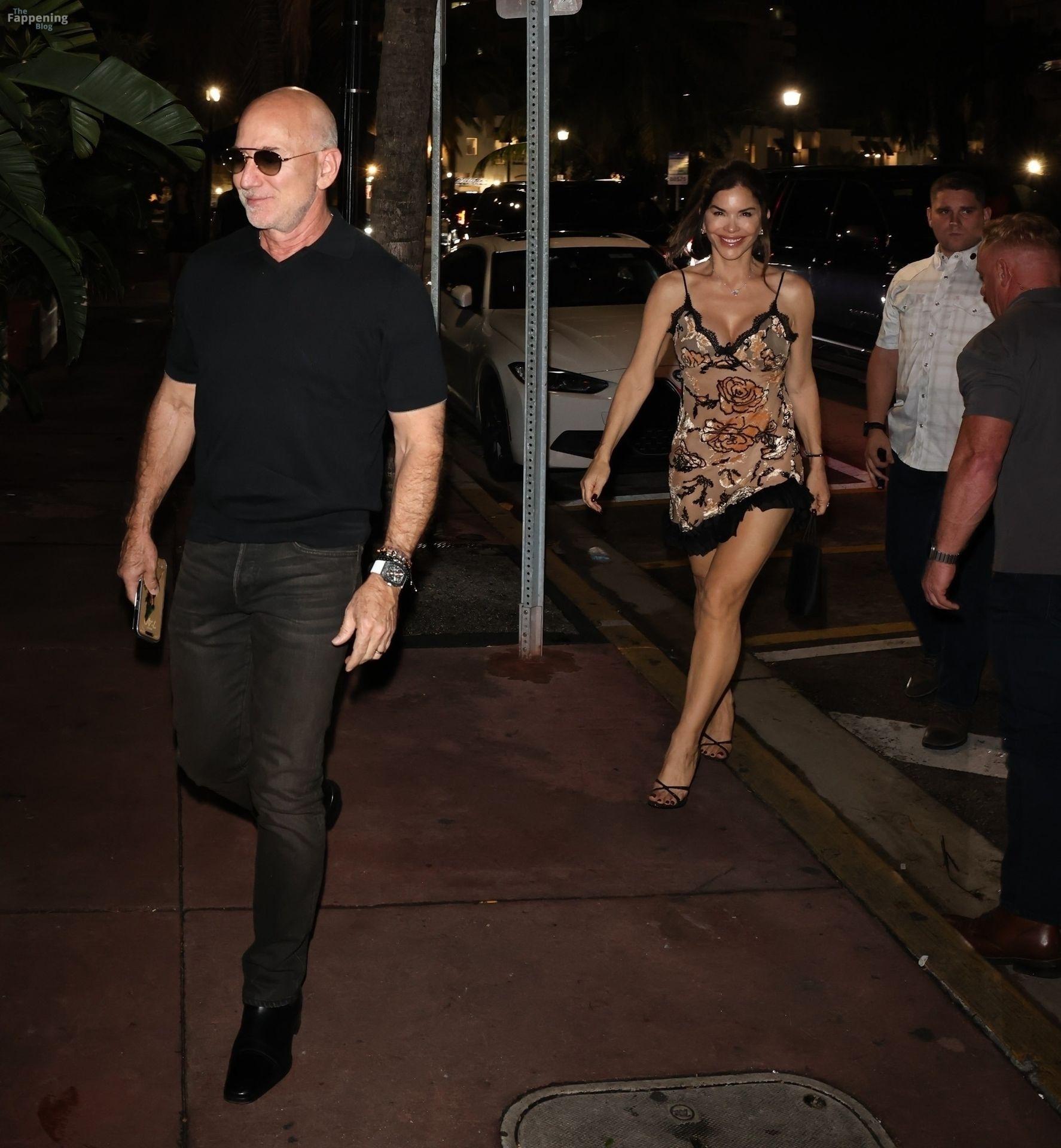 Eine regnerische Nacht in Miami Beach wartete darauf, dass Jeff Bezos und Lauren Sanchez für ein romantisches Abendessen im Carbone auftauchten. Lauren erschien wie immer schick, trug ein knappes schwarzes Spitzen-Minikleid mit Blumenstickerei und einem gerafften Saum, der ihre durchtrainierten Beine zur Geltung brachte.