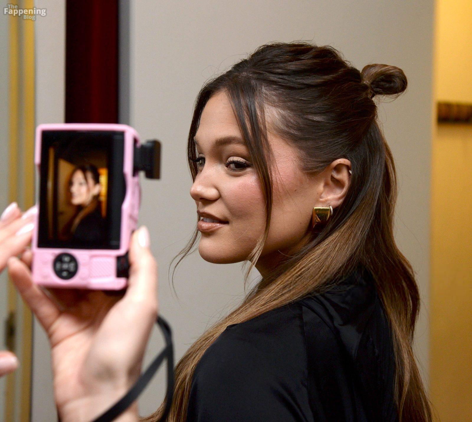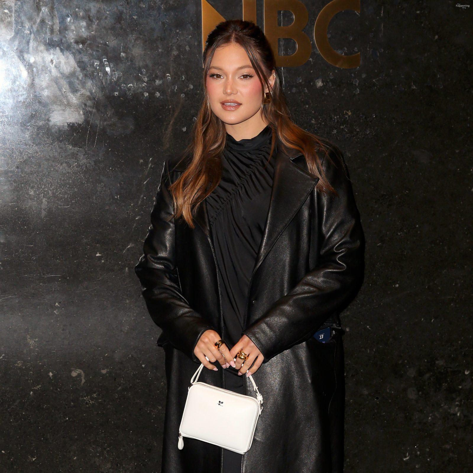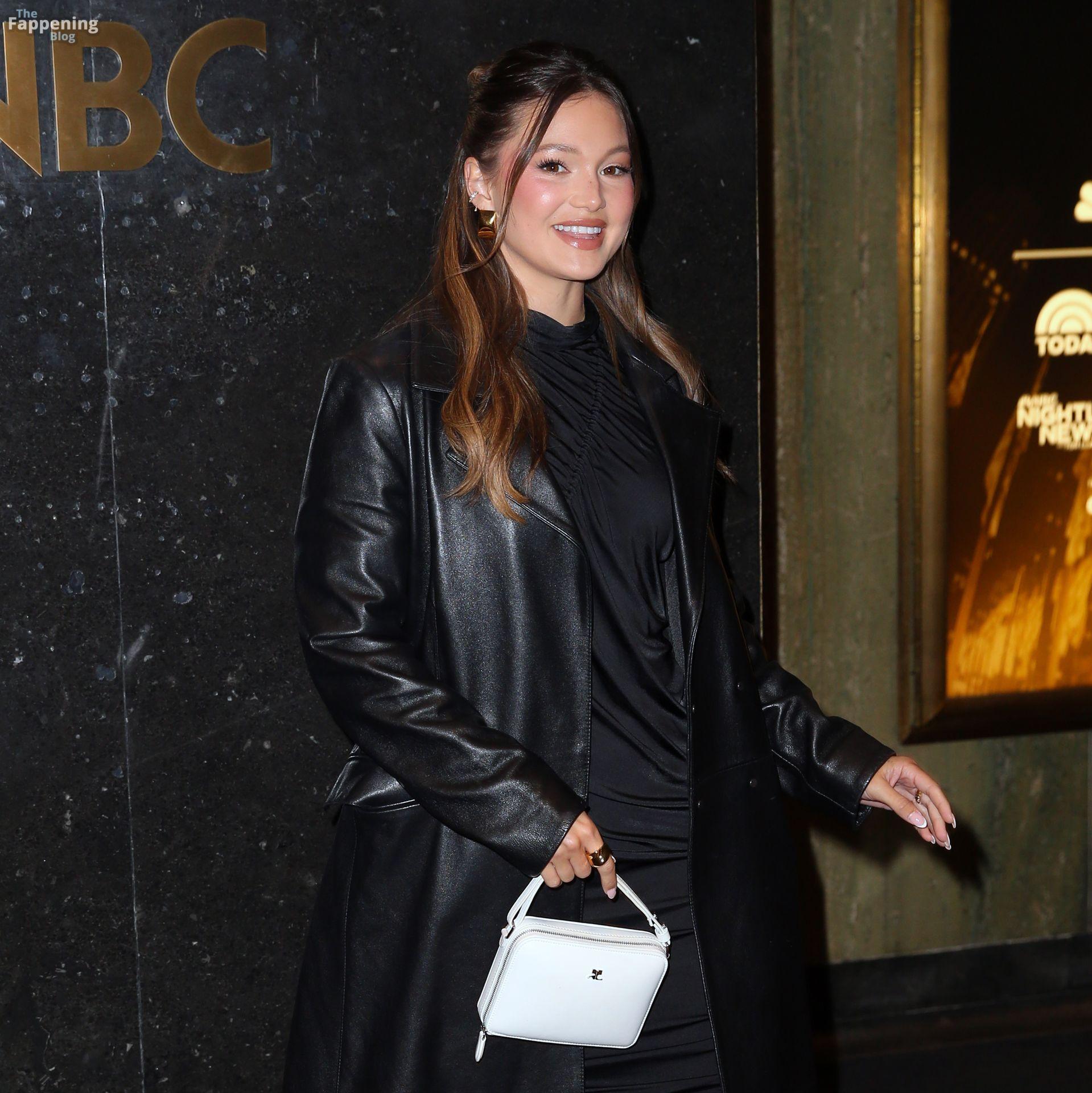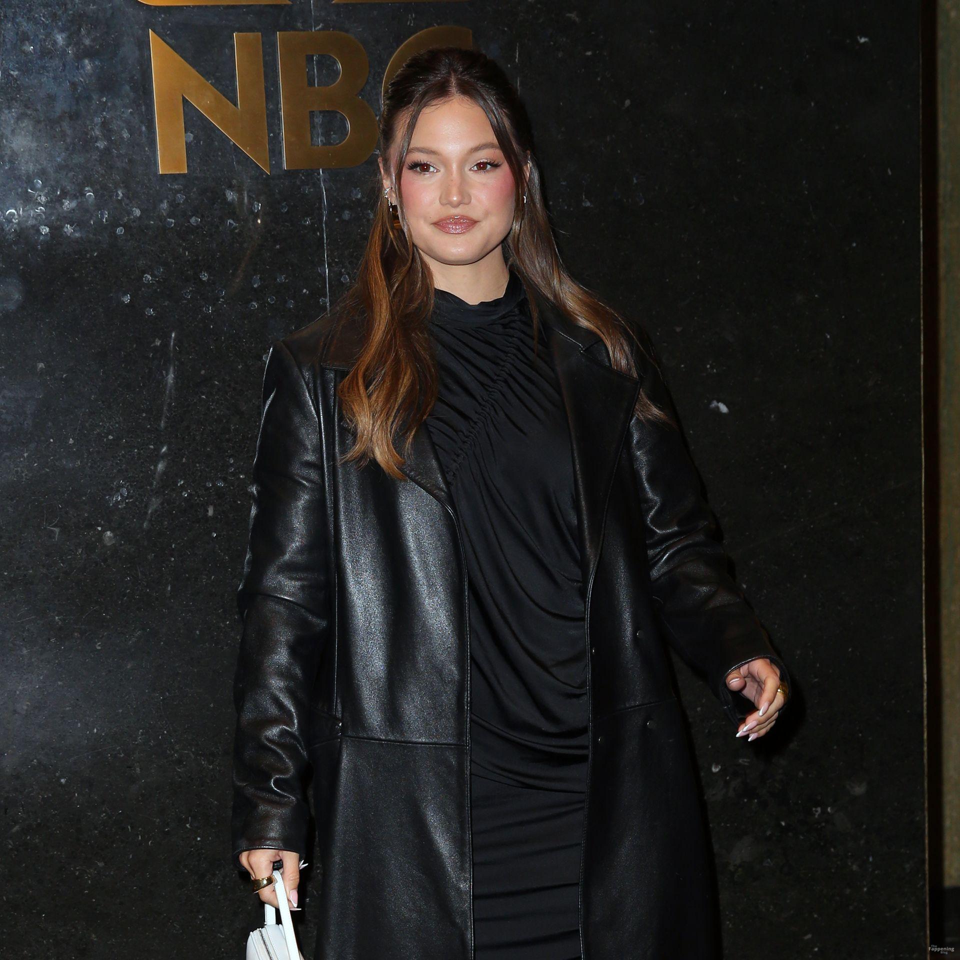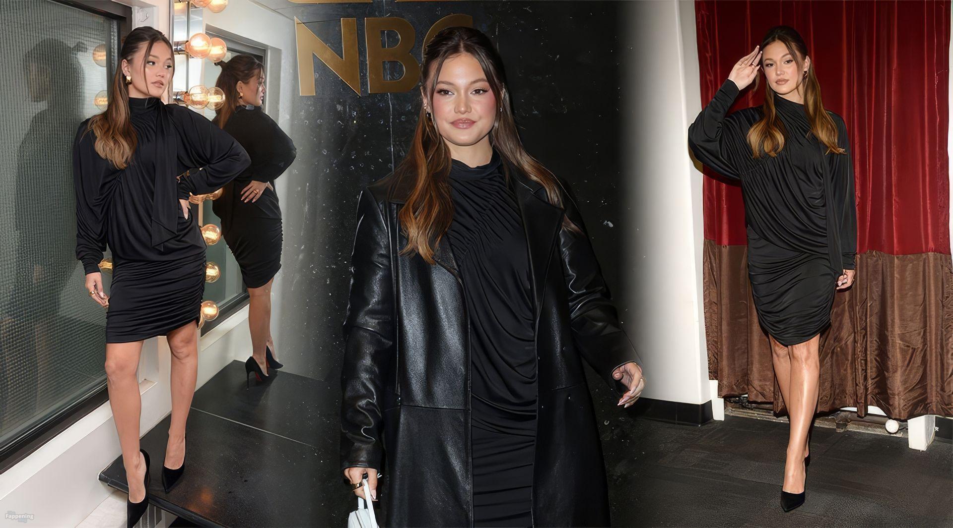 Olivia Holt zeigt ihre Beine in einem schwarzen Lederübermantel und einem schwarzen Kleid, während sie zu New York Live fährt.