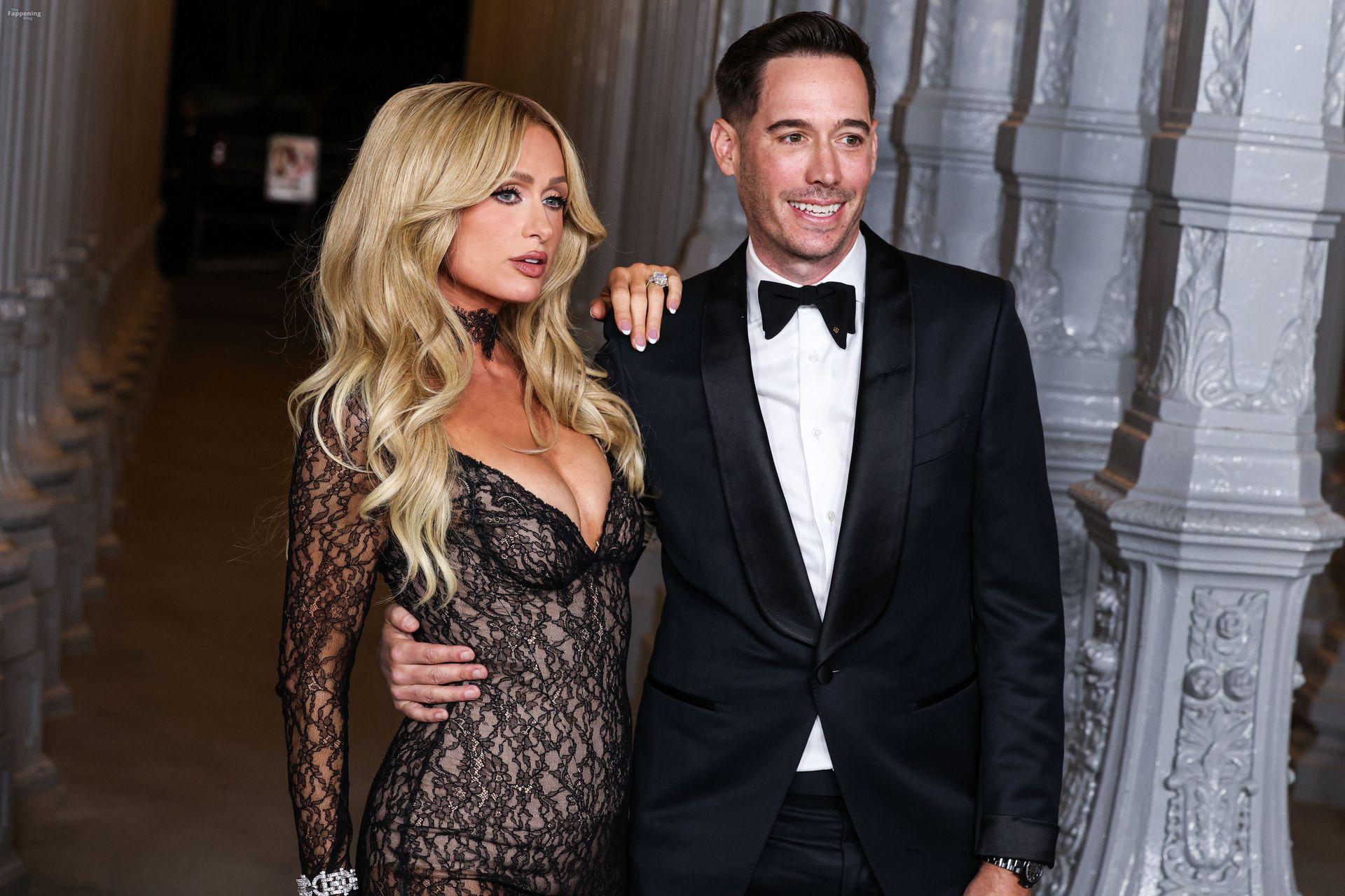 Paris Hilton erschien bei der LACMA Art+Film Gala 2025 in Los Angeles, Kalifornien. Sie posierte für Fotos mit ihrem Ehemann Carter Reum in einem durchsichtigen Spitzenkleid mit tiefem V-Ausschnitt über einem hautfarbenen Body.