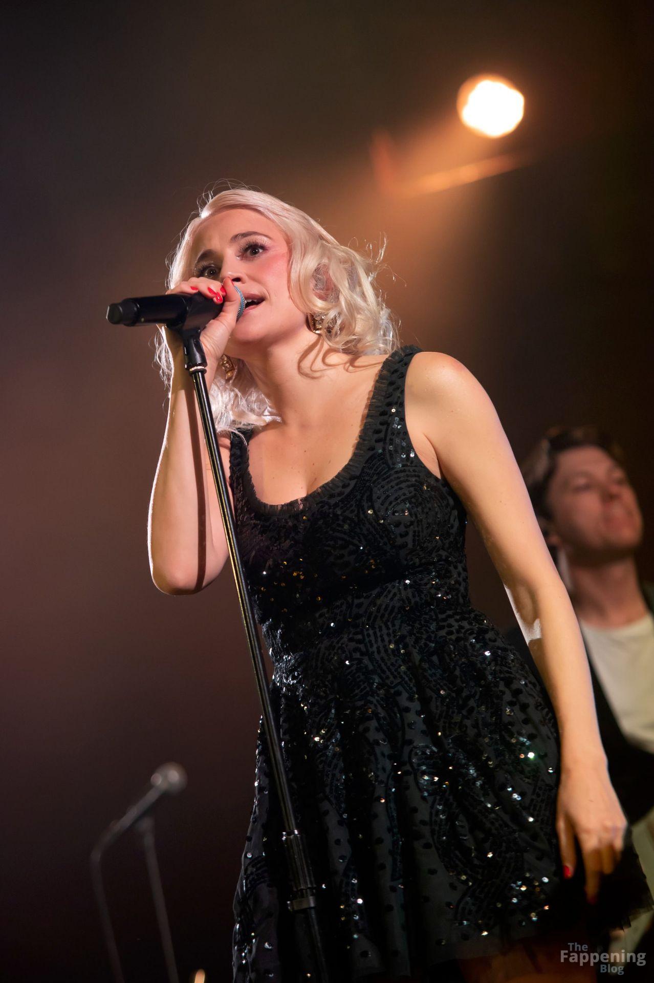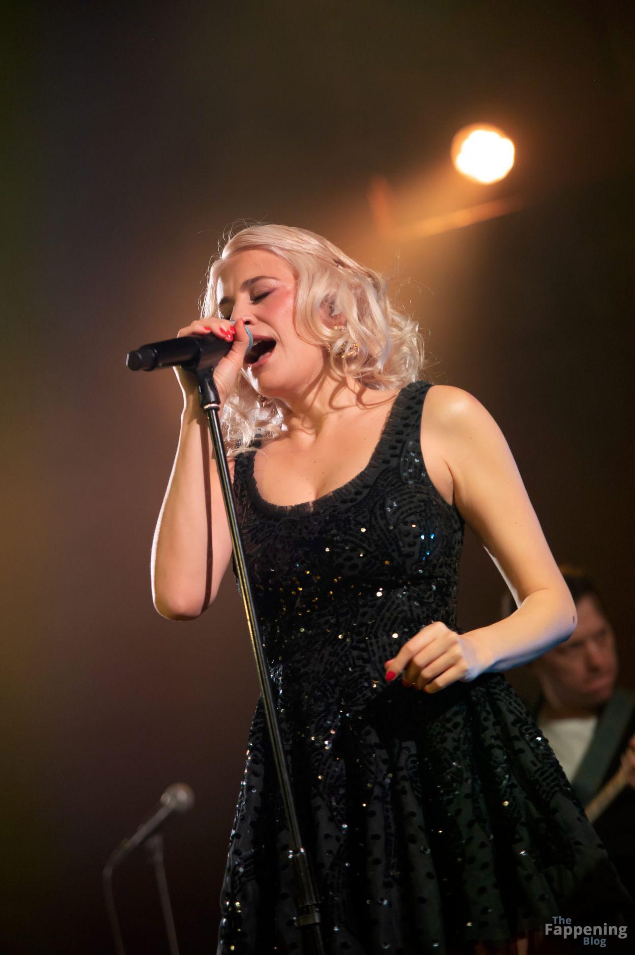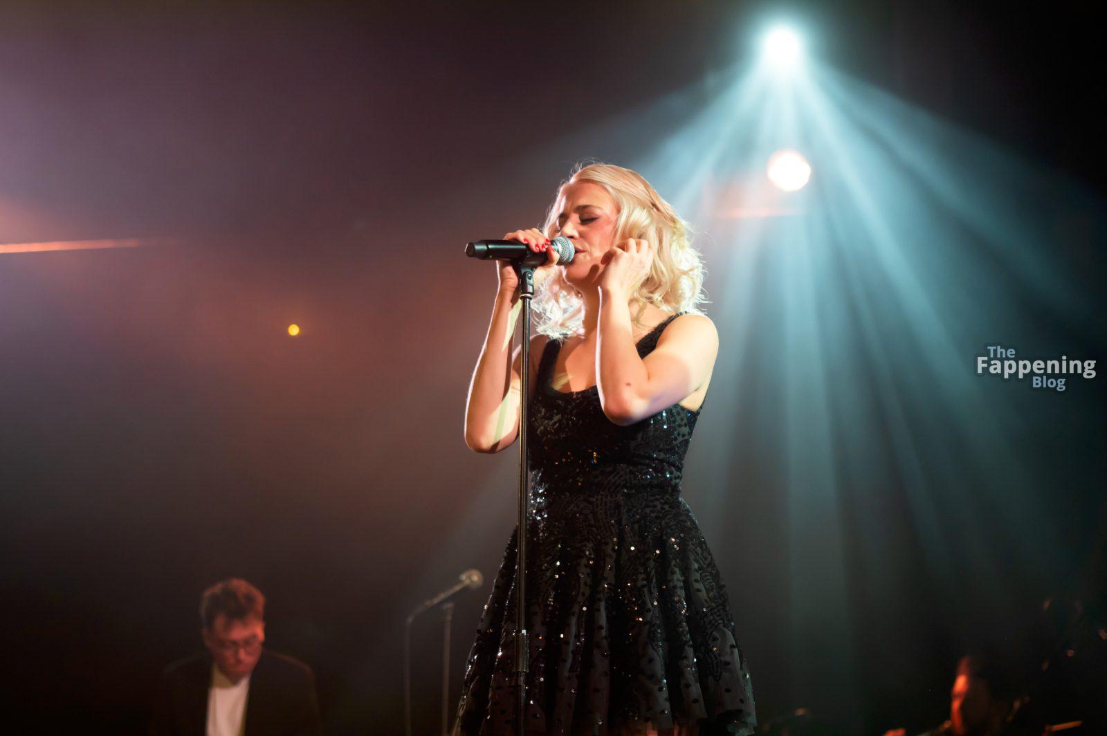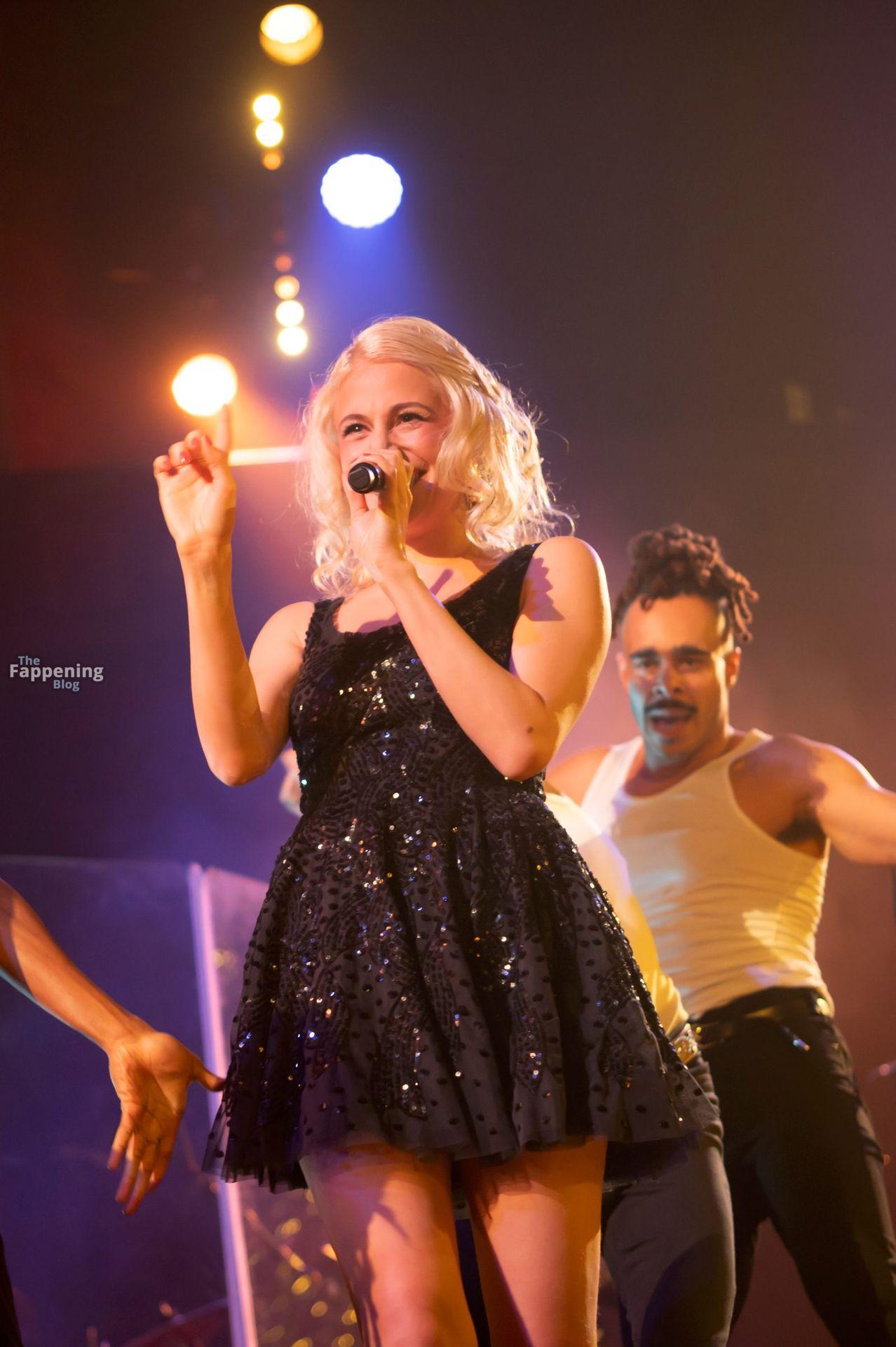 Pixie Lott wurde beim Konzert in London abgelichtet, wie sie ein schwarzes Pailletten-Minikleid trug und ihre Beine sowie ihr Dekolleté zur Schau stellte.