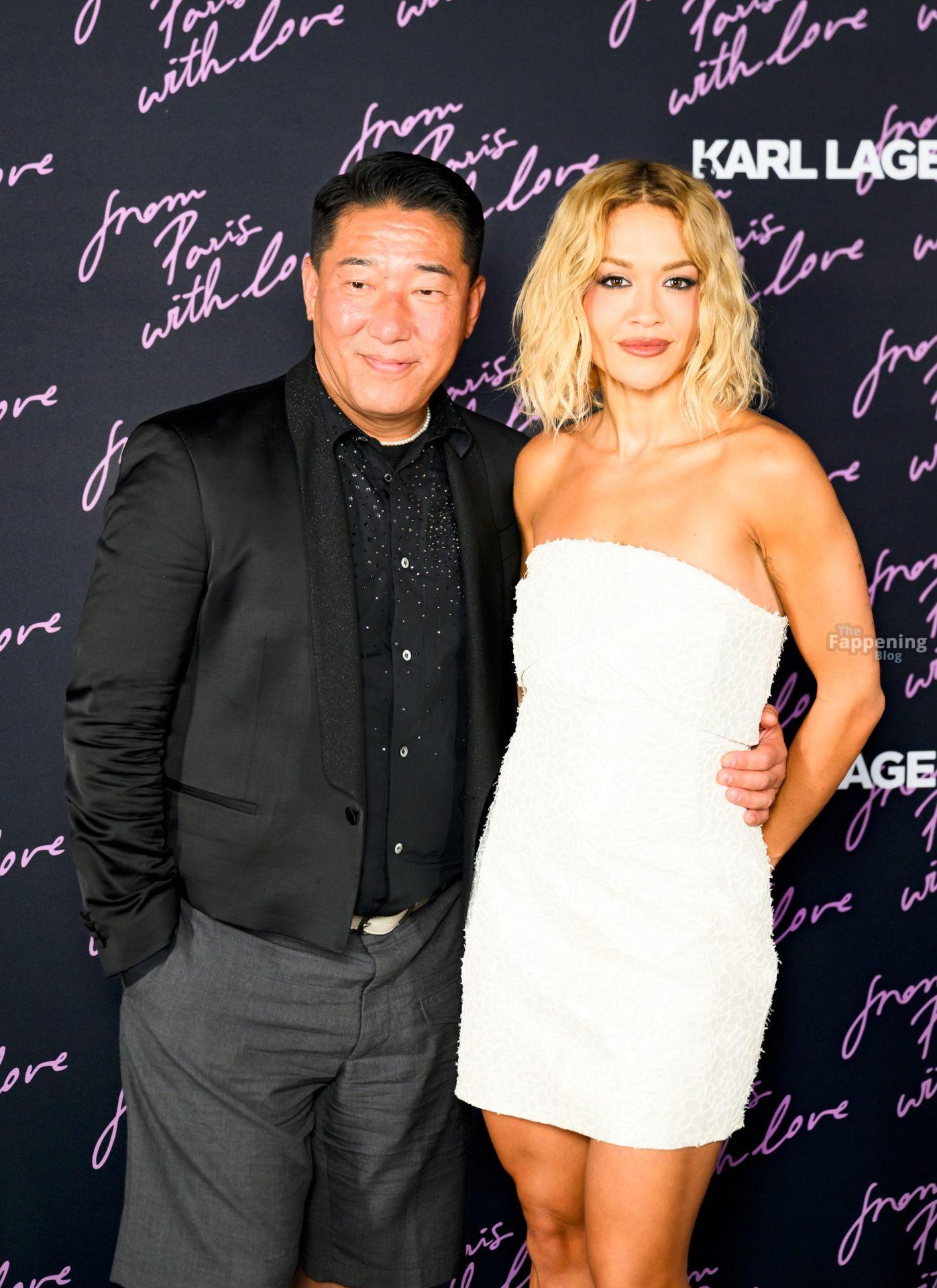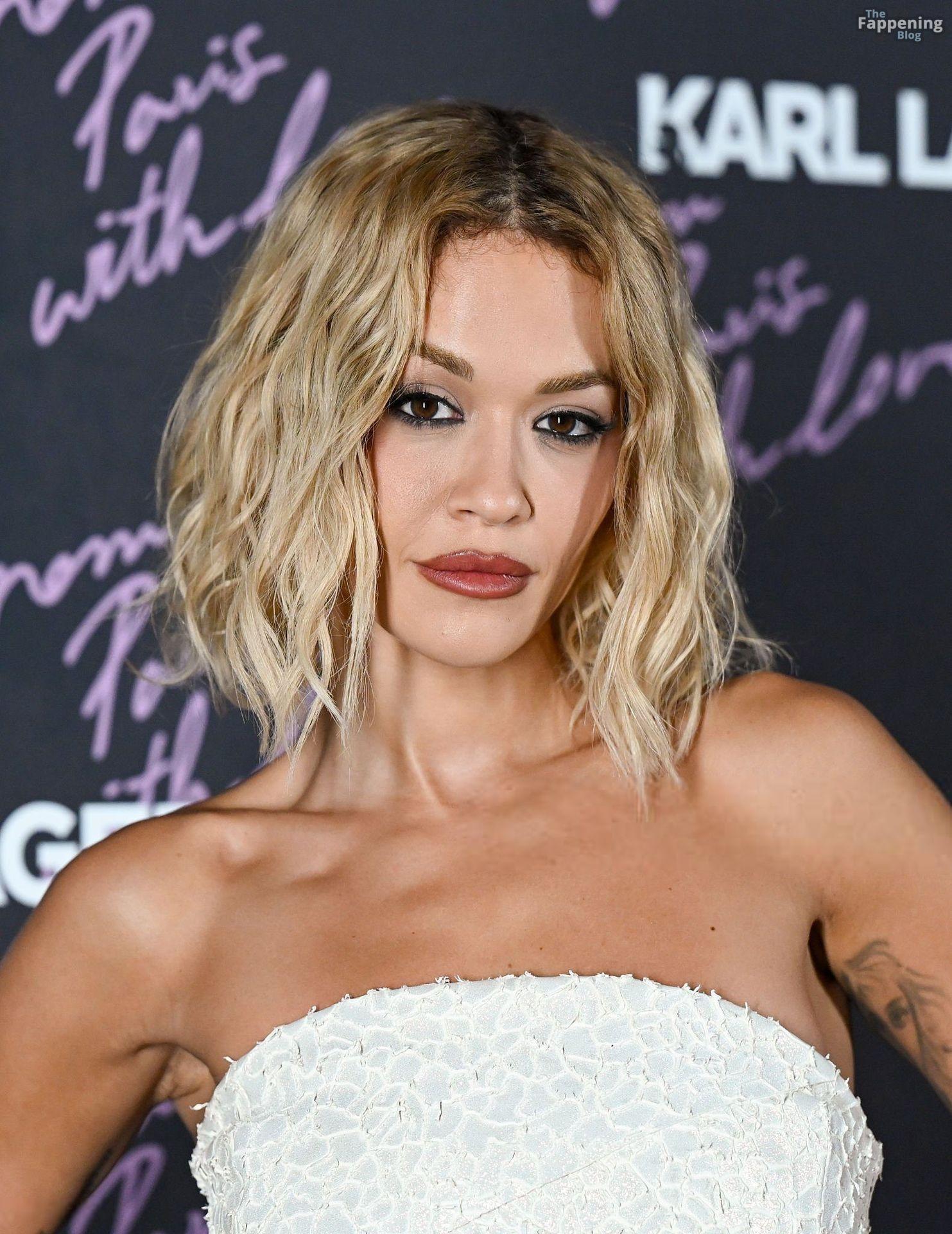 Rita Ora beeindruckte auf Karl Lagerfelds Party in Paris in einem trägerlosen weißen Mini-Kleid. Sie zeigte ihre straffen Beine und etwas Ski.
