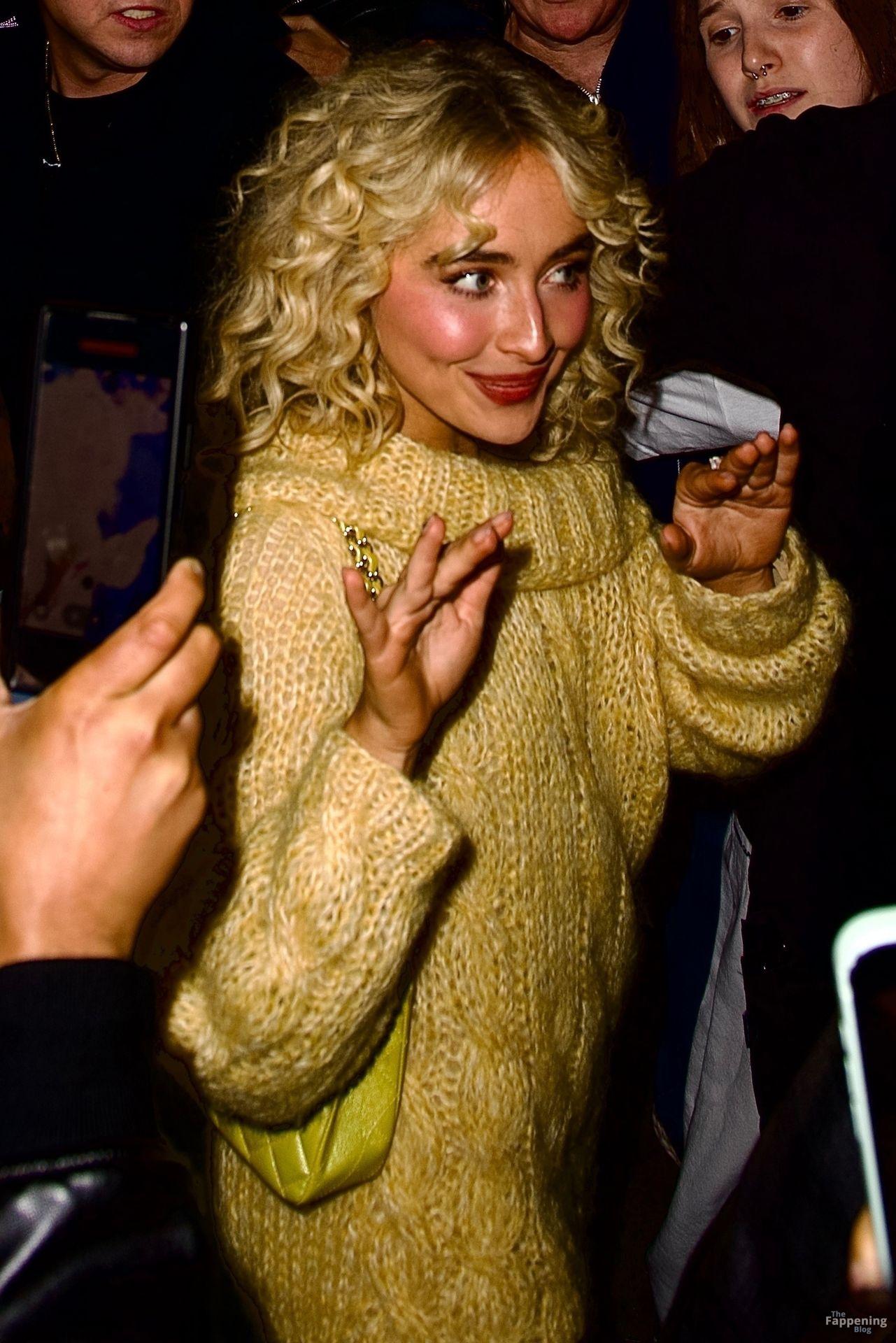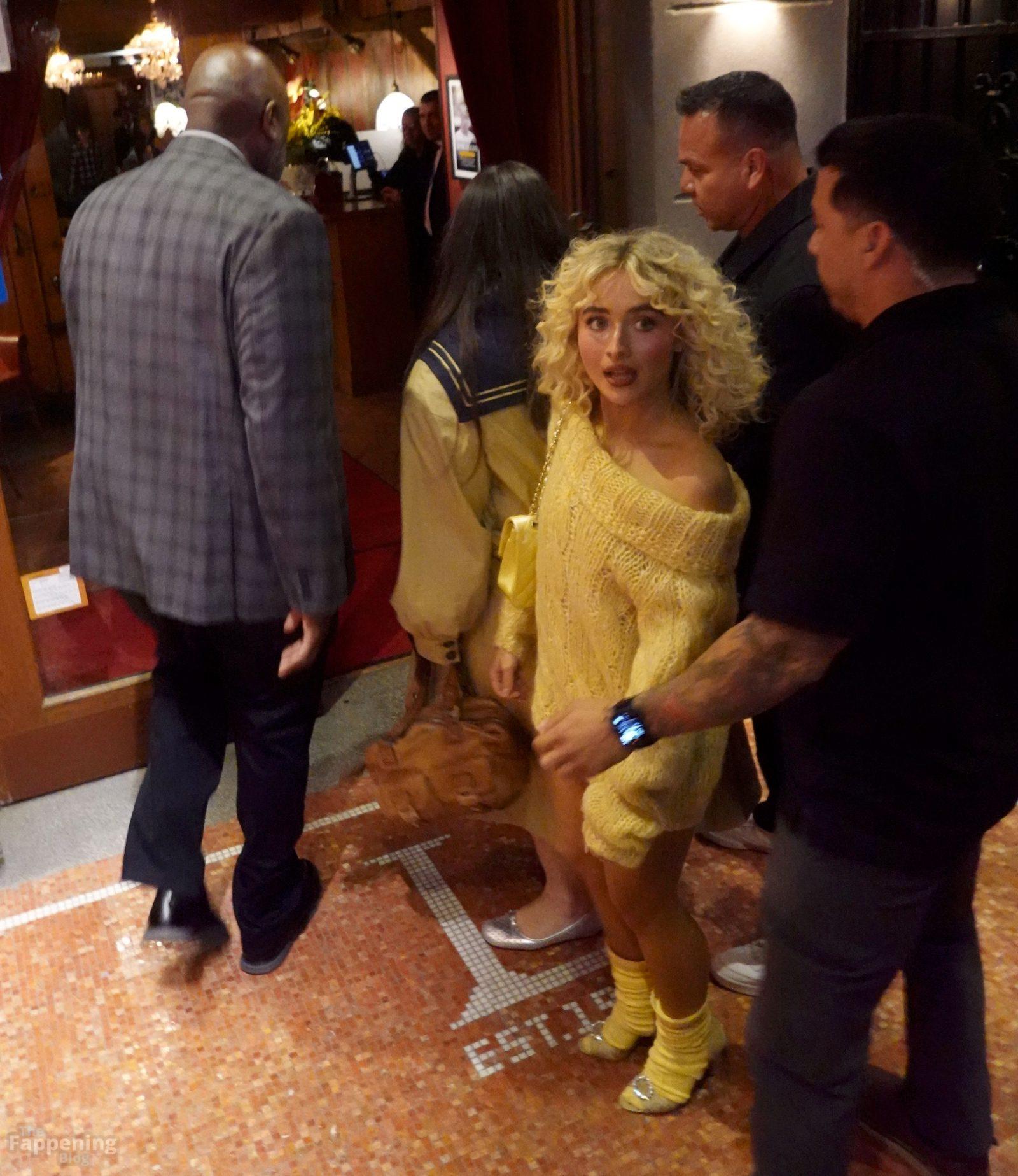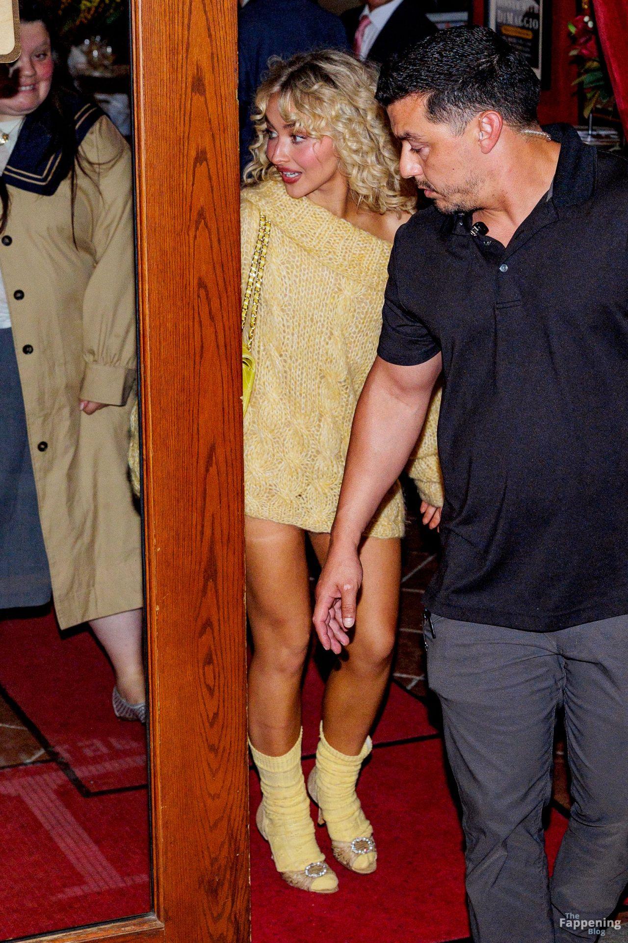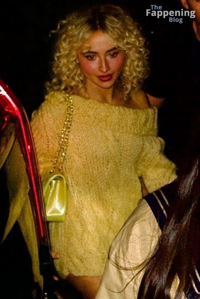 Sabrina Carpenter zeigte ihre Beine in einem gewagten, hosenlosen goldenen Pullover, mit lockigen Haaren und einer Mini-Tasche bei einem SNL-Abendessen in NYC.