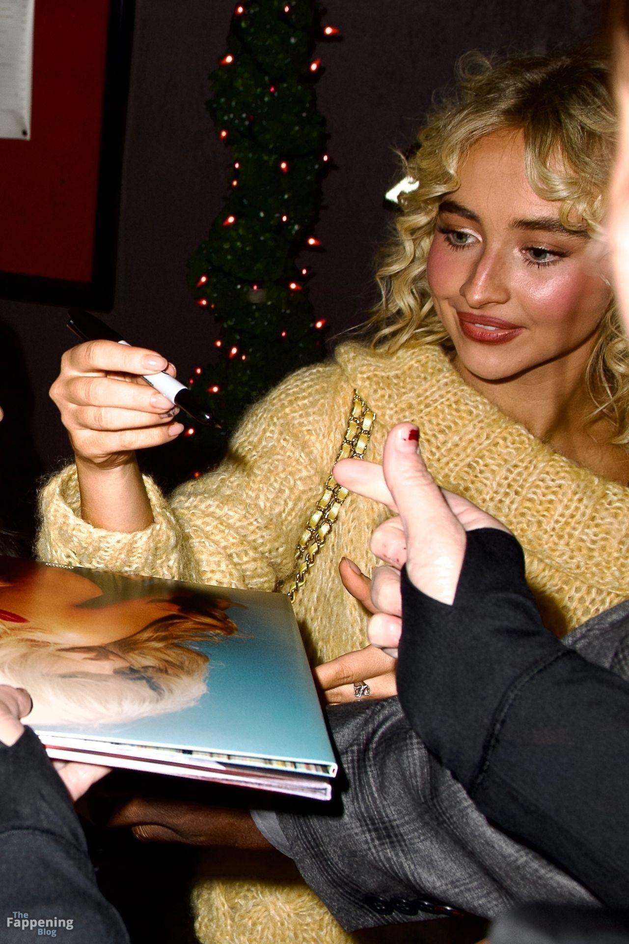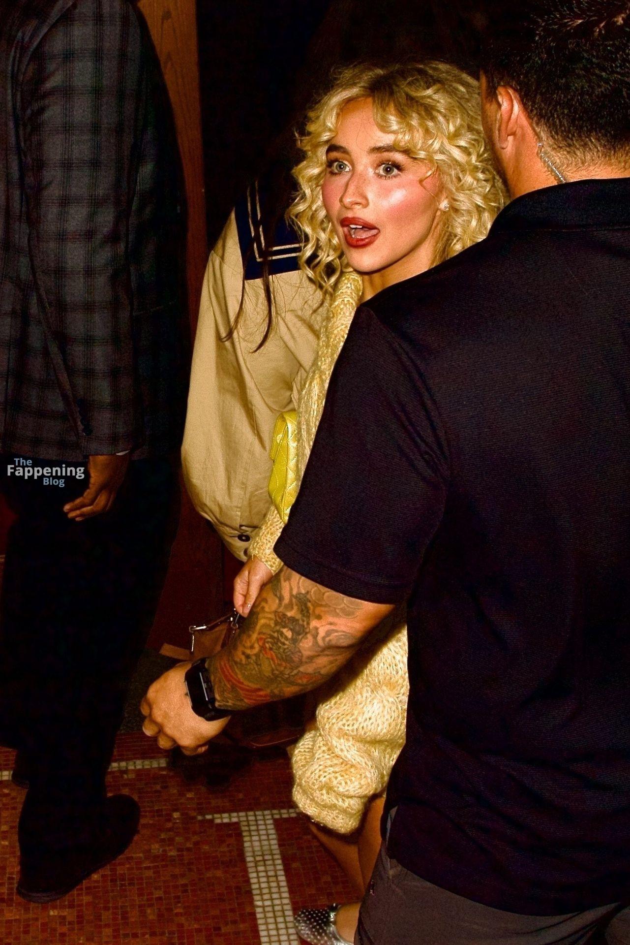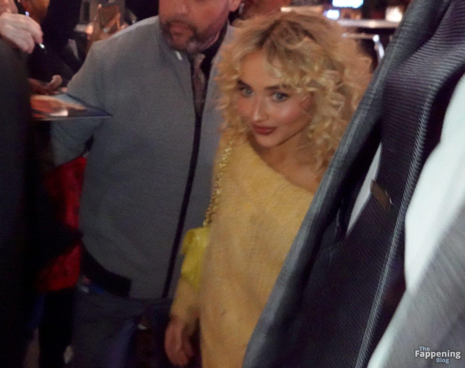 Sabrina Carpenter zeigte ihre Beine in einem gewagten, hosenlosen goldenen Pullover, mit lockigen Haaren und einer Mini-Tasche bei einem SNL-Abendessen in NYC.