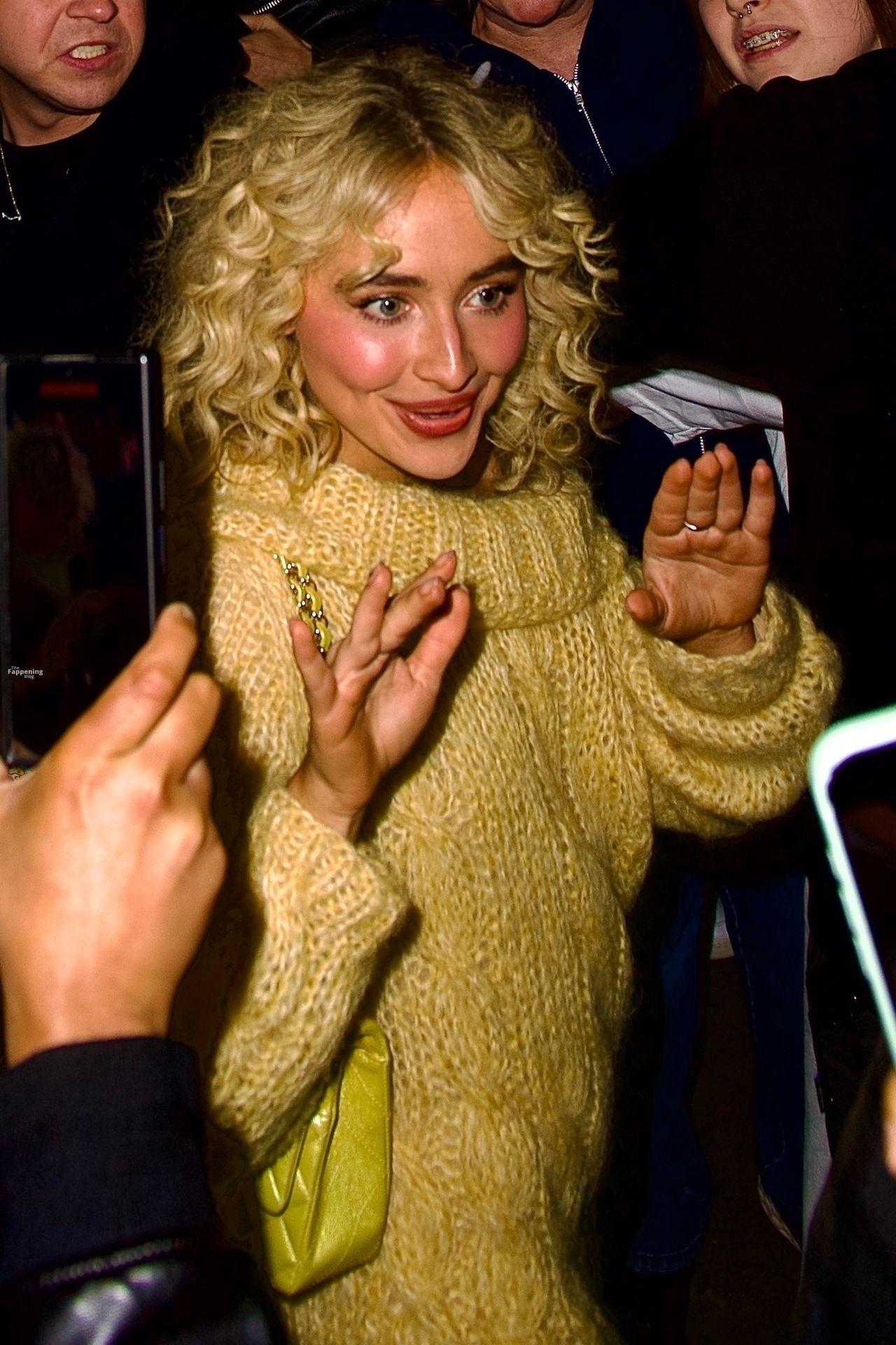 Sabrina Carpenter zeigte ihre Beine in einem gewagten, hosenlosen goldenen Pullover, mit lockigen Haaren und einer Mini-Tasche bei einem SNL-Abendessen in NYC.