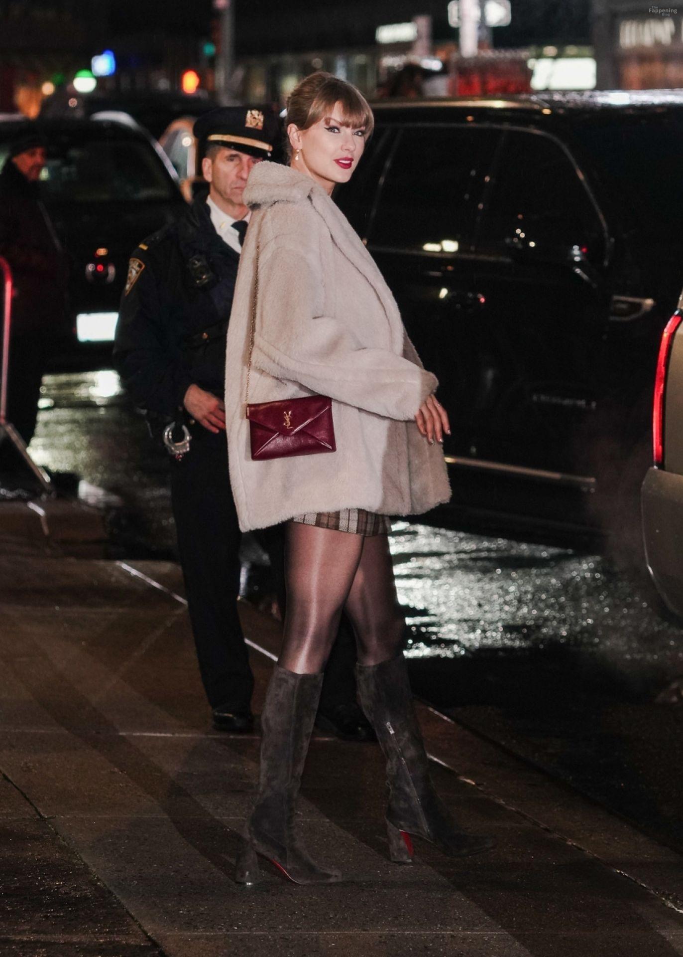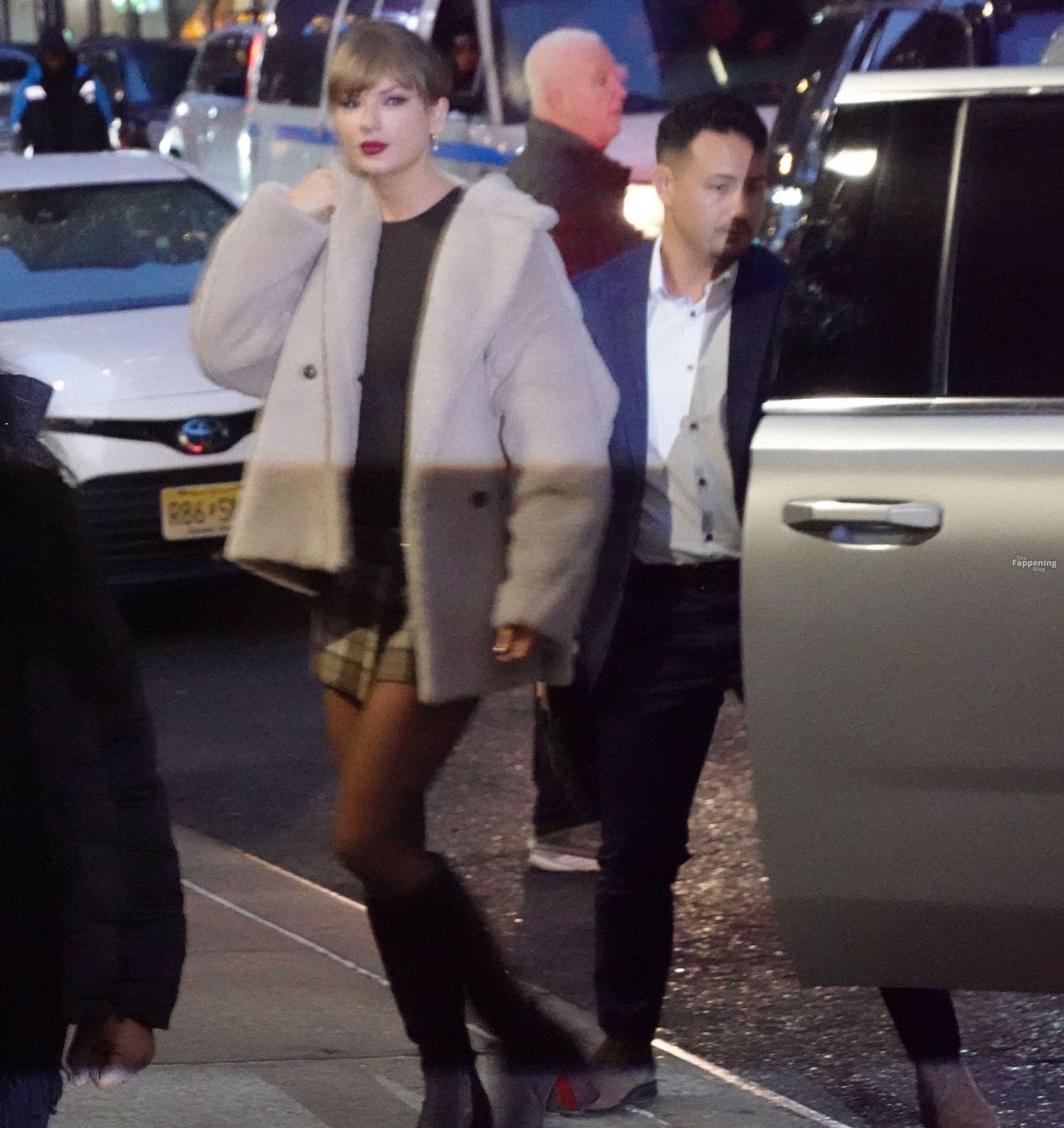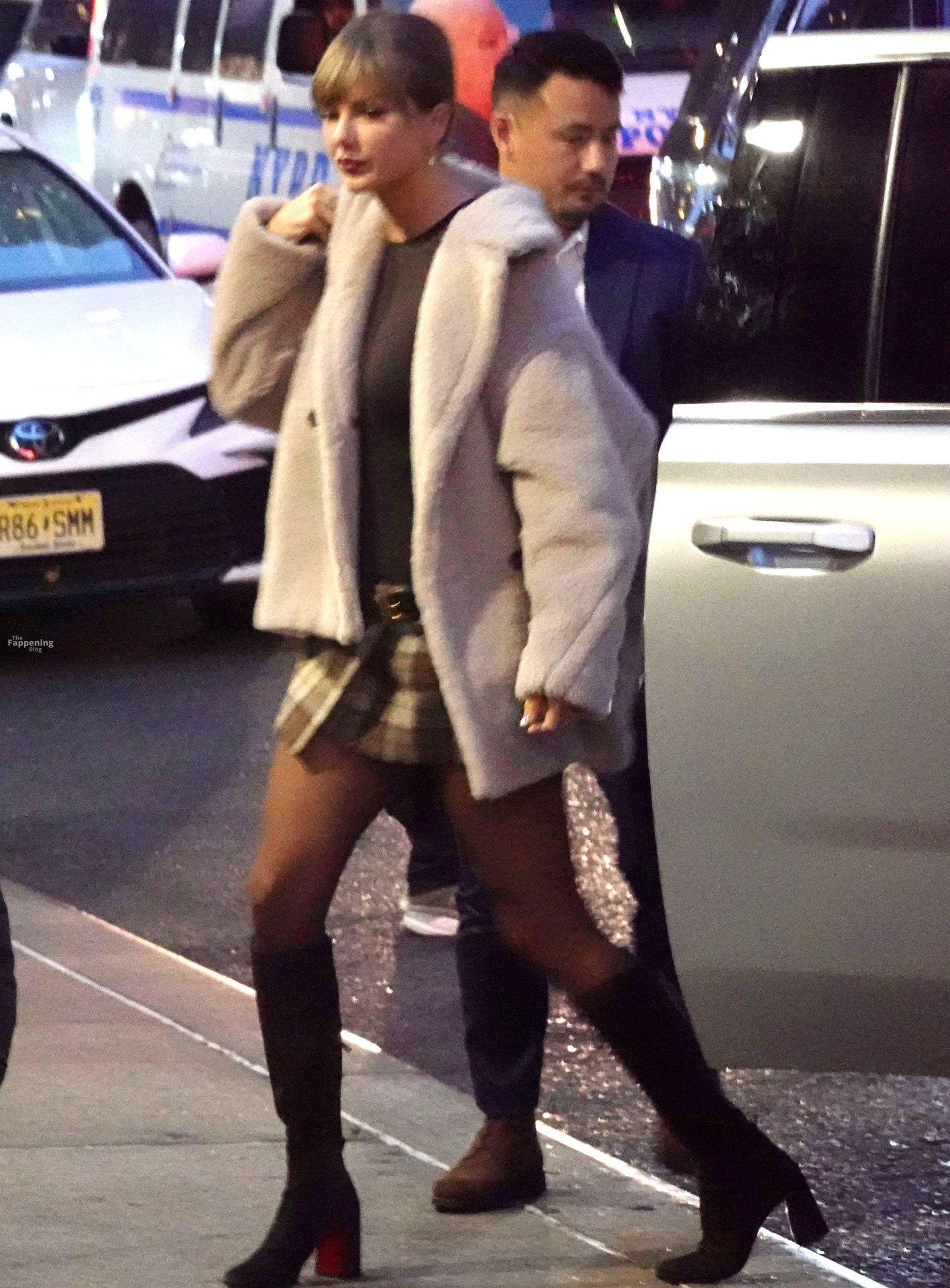 Tay‑Tay war in NYC. Trug ein kariertes Mini- und trägerloses Kleid bei Colbert – Beine und Dekolleté wurden gezeigt.