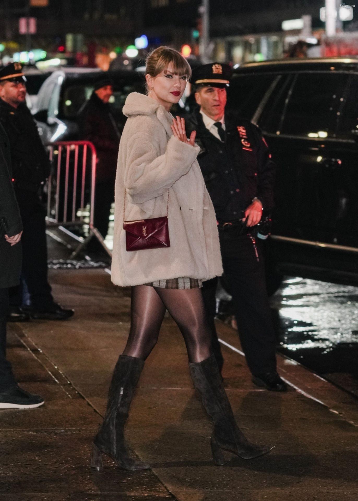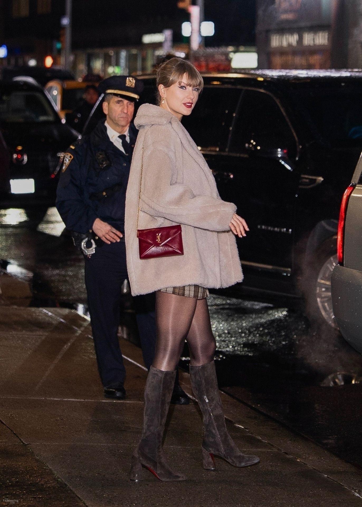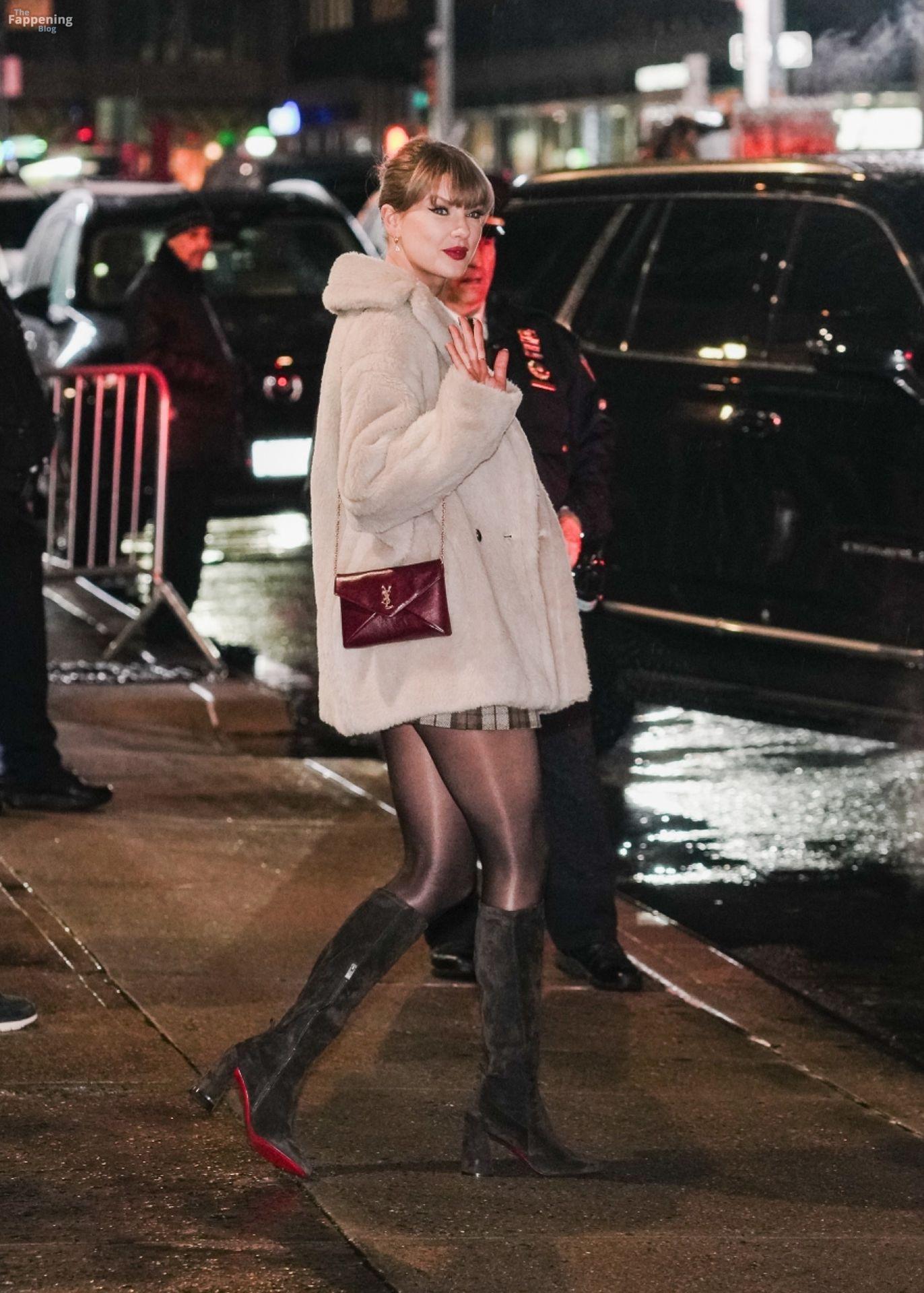 Tay‑Tay war in NYC. Trug ein kariertes Mini- und trägerloses Kleid bei Colbert – Beine und Dekolleté wurden gezeigt.